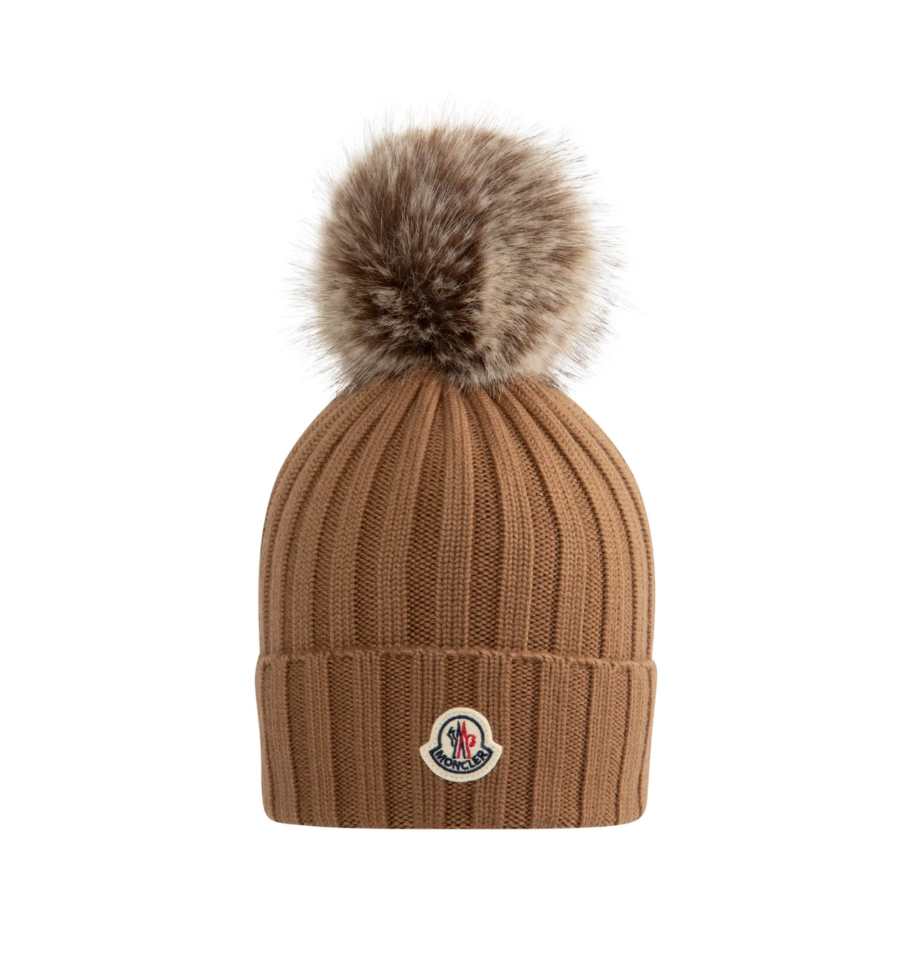 MONCLER Wool Beanie with Pom Pom featuring Merino wool, ribbed knit and faux fur pom pom. 100% virgin wool. DESIGNER STYLE ID: 3B000-64-A9327 COLOR: 238 BROWN