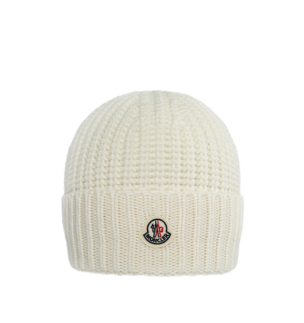 MONCLER Rhinestone Logo Beanie has a rhinestone encrusted logo patch and wide cuff. 100% virgin wool. DESIGNER STYLE ID: 3B000-48-M1131 COLOR: 030 WHITE