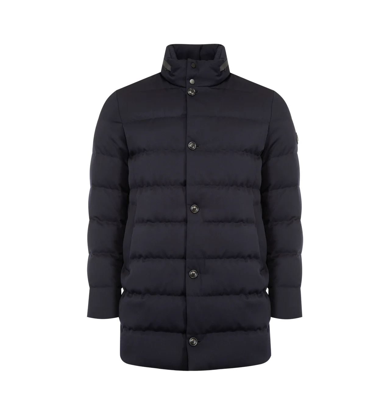 MONCLER Vallonpierre Hooded Long Down Jacket featuring Aquaflect, nylon lining, down-filled, detachable and adjustable hood, collar with leather trim, zipper and snap button closure, pockets with zipper and snap button closure, adjustable cuffs, hem with drawstring fastening and leather logo patch. 100% virgin wool. Lining: 100% polyester. Padding: 90% down, 10% feather. Made in Romania. DESIGNER STYLE ID: 1C000-15-54ANL COLOR: 778 NAVY