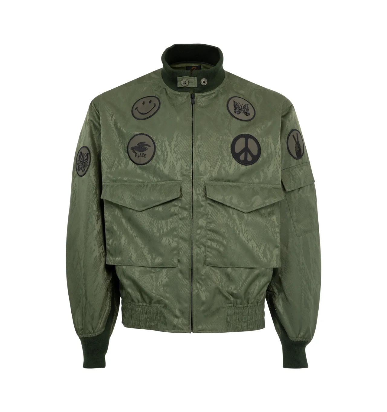 NEEDLES G-8 Jacket featuring front zip closure, 2-pocket styling, embroidered iron-on badges, elastic waistband and midweight ripstop fabric. 100% cotton. Made in Japan. DESIGNER STYLE ID: QV129 COLOR: OLIVE