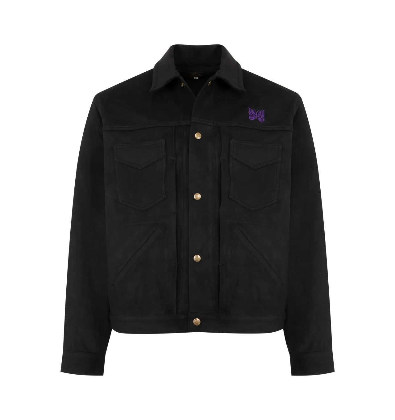 NEEDLES Penny Jean Jacket featuring double chest and front welt pockets with pleated detail, button front closure, collar and buttoned cuffs. Made in Japan. DESIGNER STYLE ID: RW248 COLOR: BLACK