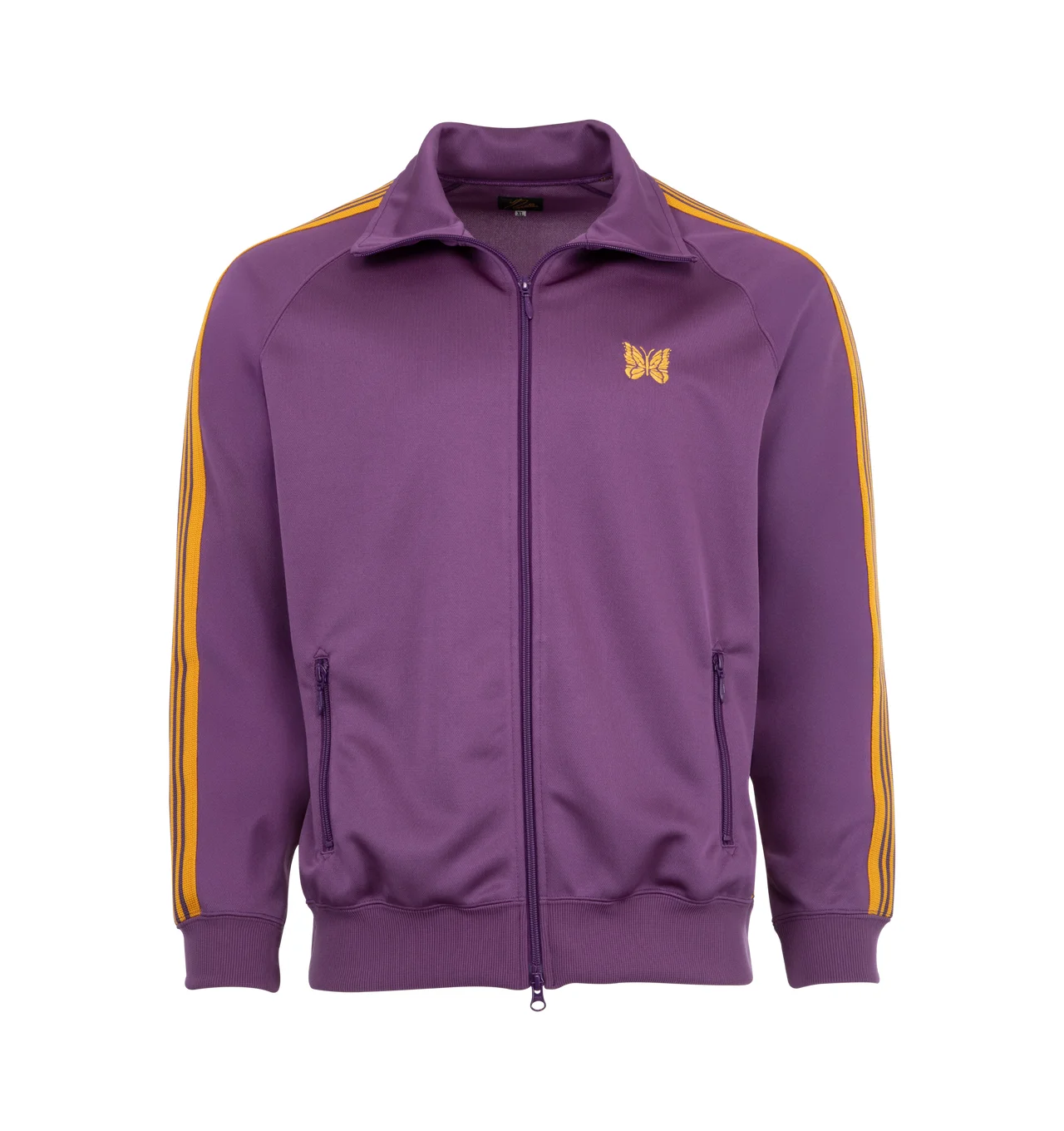 NEEDLES Track Jacket featuring polyester interlock jersey, stand collar, two-way zip closure, logo graphic embroidered at chest, zip pockets, rib-knit hem and cuffs and striped knit trim at side seams and raglan sleeves. 100% polyester. Made in Japan. DESIGNER STYLE ID: QV305 COLOR: PURPLE