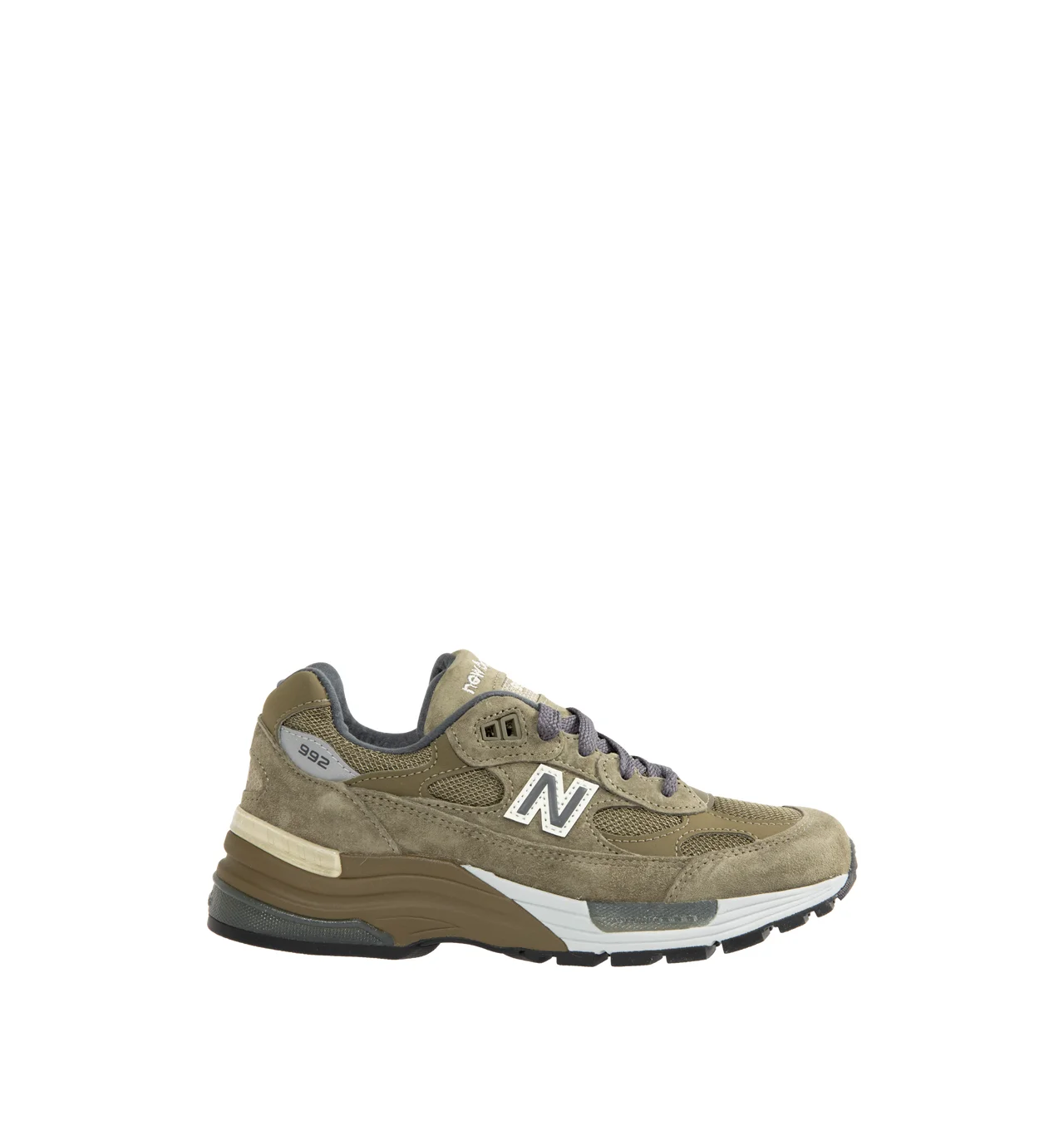 NEW BALANCE USA 992 Sneaker featuring mesh upper with pigskin suede overlays, synthetic layers on the forefoot, collar, and rear tab, a white outline highlights the “N” on the sidewalls, embroidered New Balance branding on the tongue, USA label on the back panel, silver “992” near the collar, ENCAP and C-CAP technologies on the midsole, ABZORB technology in the forefoot and heel and an Ndurance rubber outsole. DESIGNER STYLE ID: U992GL COLOR: DARK CAMO