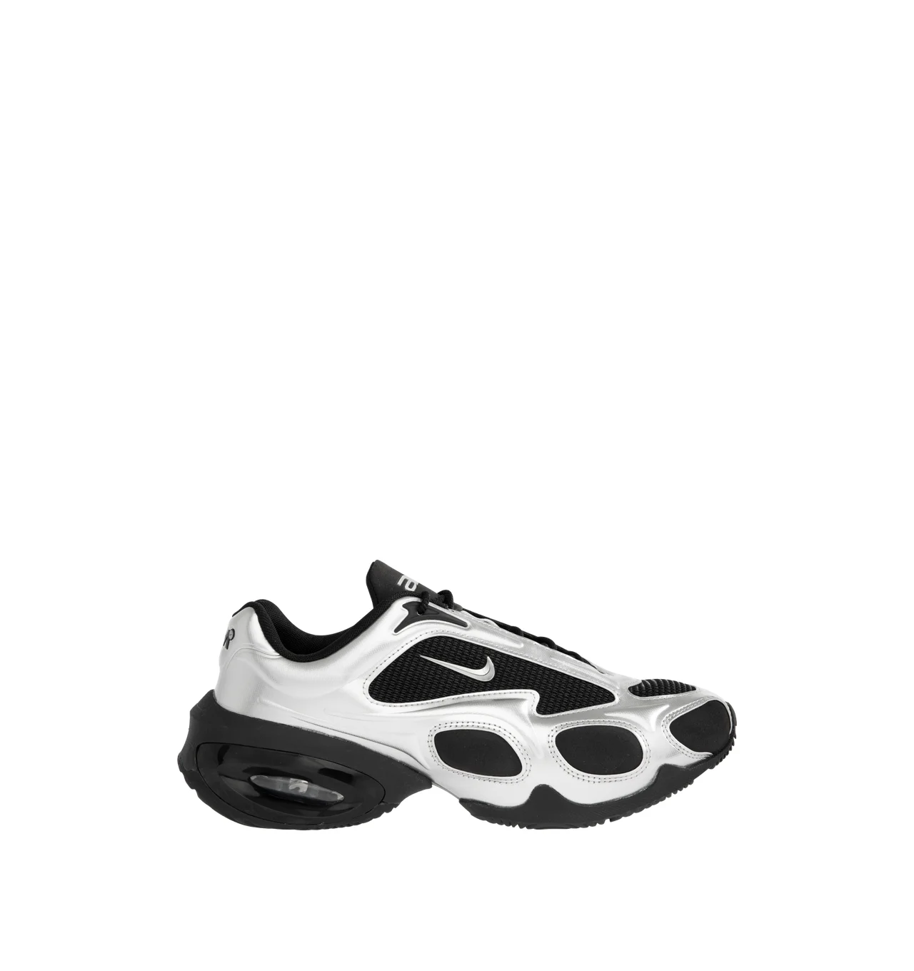 NIKE Air Max Muse Sneaker featuring mesh upper with faux leather trim and rubber sole, lace-up front, cushioned foam midsole, Max Air cushioning and Air Max logo at tongue. DESIGNER STYLE ID: FV1920-001 COLOR: BLACK/METALLIC SILVER