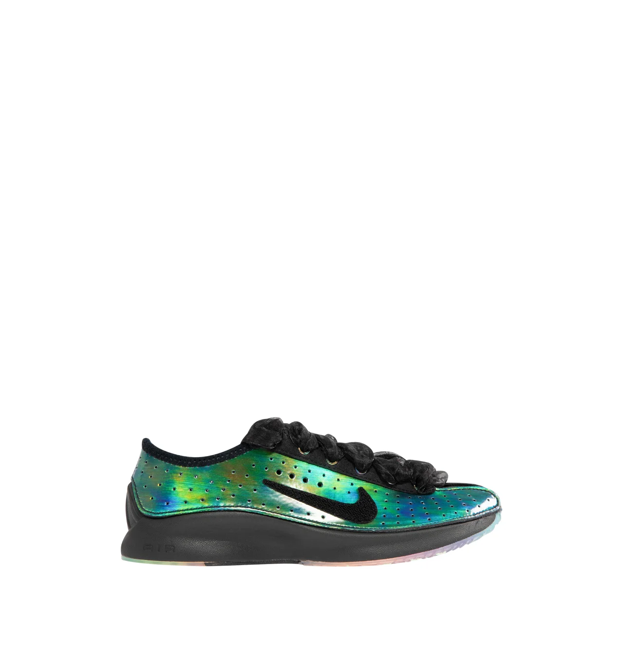 NIKE Air Superfly x Tomo Koizumi Sneaker featuring featherweight runner wrapped in an iridescent upper, Velcro-backed Nike Swooshes come with three different sets for swapping and rainbow outsole. DESIGNER STYLE ID: IH2110-002 COLOR: BLACK/BLACK/PHOTO BLUE/FIERCE PURPLE