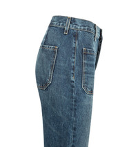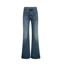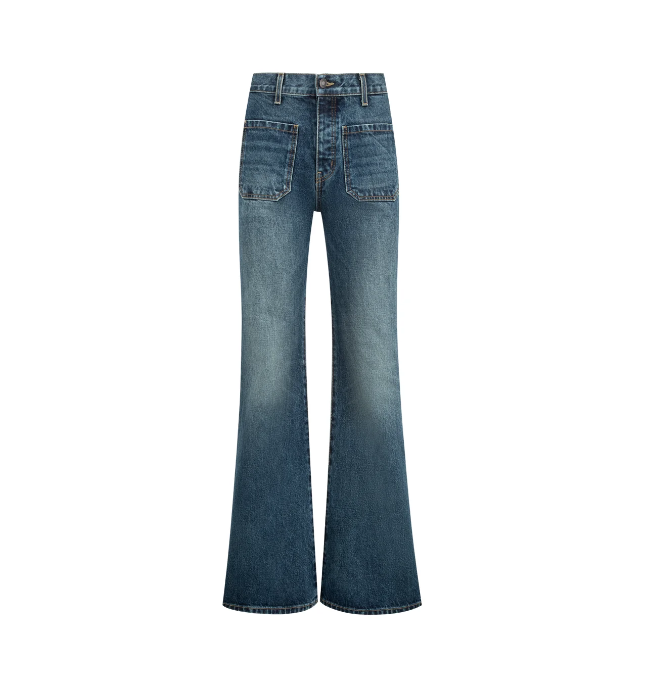 NILI LOTAN Florence Jean featuring high-rise flare leg jean in Japanese stretch denim, fitted through waist and hips, front and back top stitched patch pockets, button fly, shank closure and belt loops. 98% cotton, 2% polyurethane. Made in USA. DESIGNER STYLE ID: 10196-W1208 COLOR: SIMON WASH