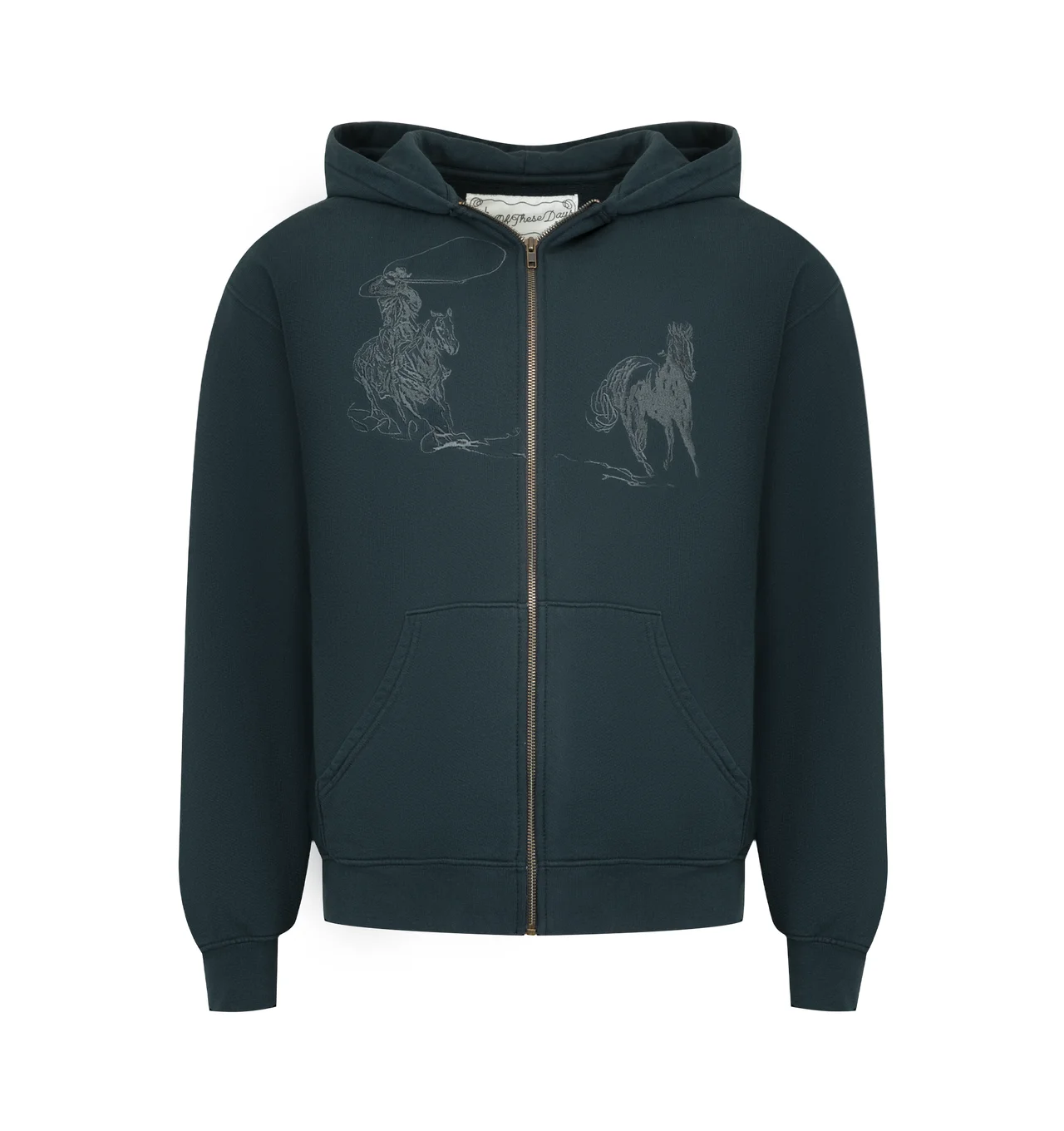 ONE OF THESE DAYS Into The Distance Zip Up Hoodie featuring an embroidered graphic on front, front zip closure, fixed hood, split kangaroo pocket and ribbed cuffs and hem. 100% cotton. DESIGNER STYLE ID: 02C-04-060 COLOR: WASHED BLACK