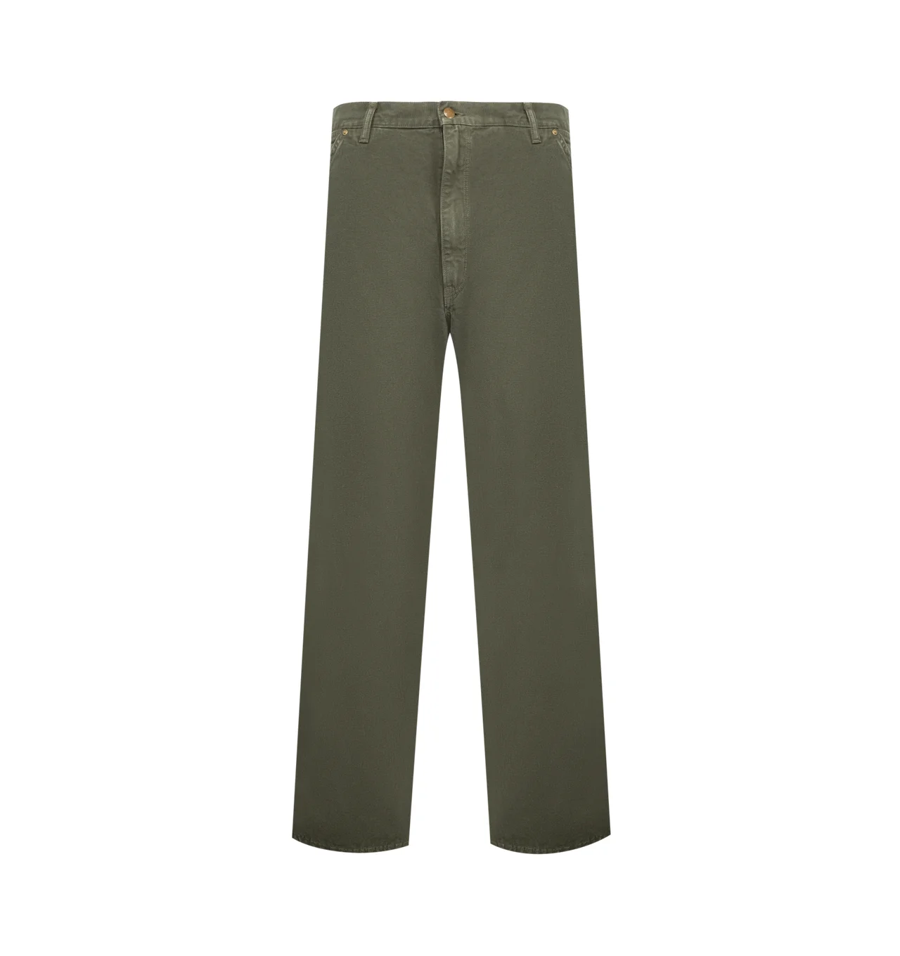 ORSLOW Dad's Fit Oxford Painter Pants featuring a wide-fit, 12.5oz denim, button zip fly, belt loops, 4 style pocket and one pocket on leg seem. 100% cotton. Made in Japan. DESIGNER STYLE ID: 01-5328-76S COLOR: 76S ARMY GREEN