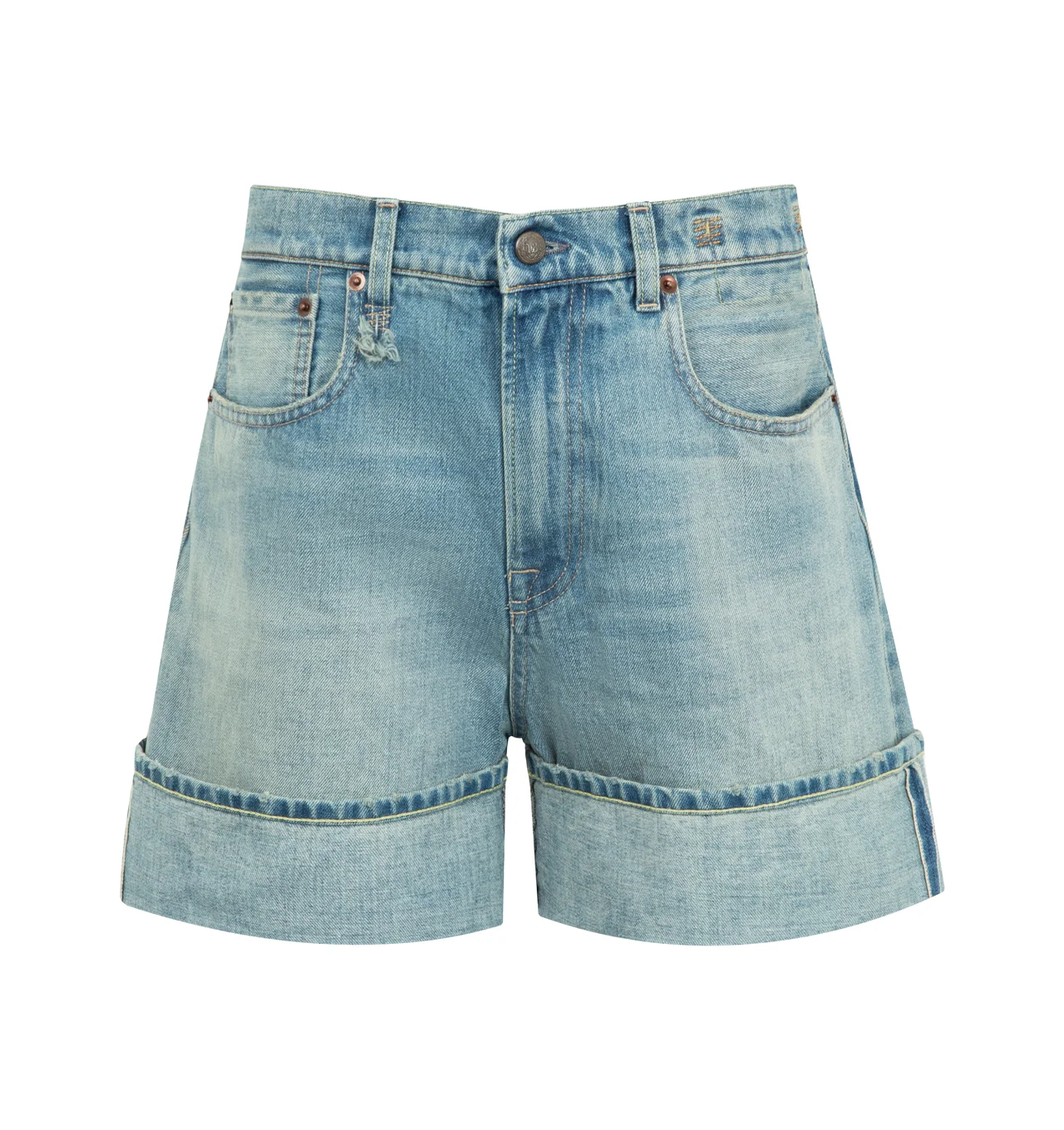 R13 Nina Shorts featuring high-rise relaxed denim short with a thick cuffed hem in Italian selvedge denim. 100% cotton. Made in Italy. DESIGNER STYLE ID: R13WD110-D415B COLOR: D415B LAPIS SELVEDGE BLUE