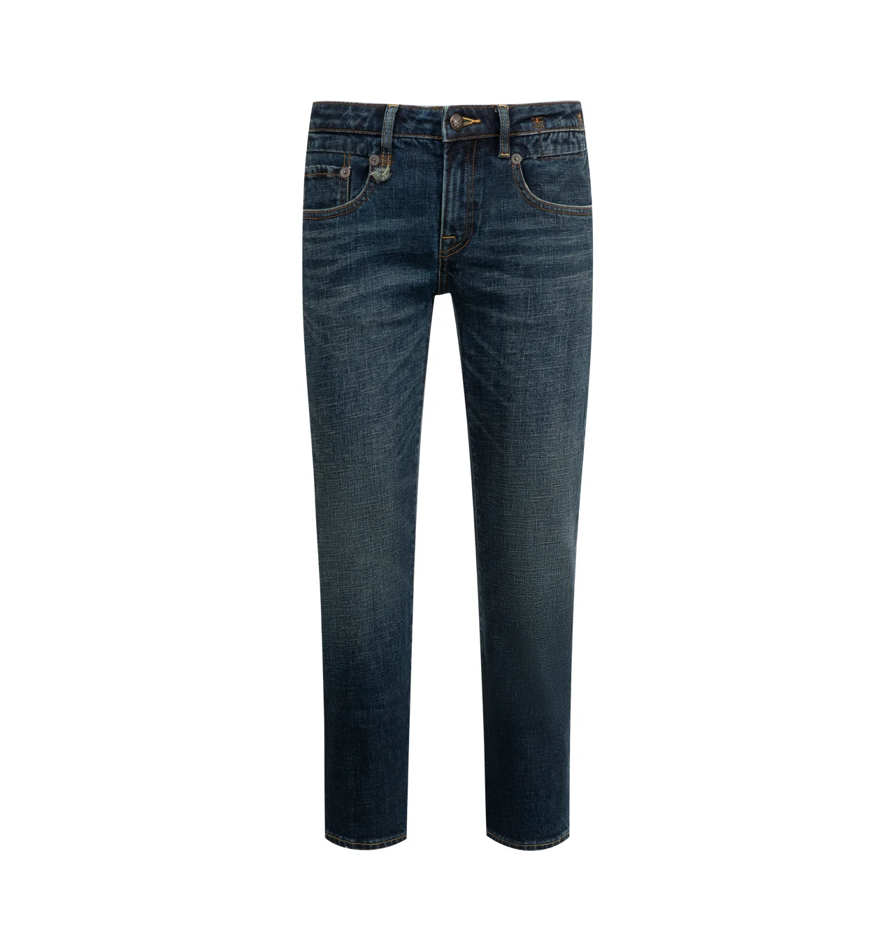 R13 Straight Boy Jeans featuring zip fly with button closure, 5 pocket design, intentionally distressed areas and heavy whiskering and fading detail. 100% cotton. DESIGNER STYLE ID: R13W0091 COLOR: D345A HOYT BLUE STRETCH