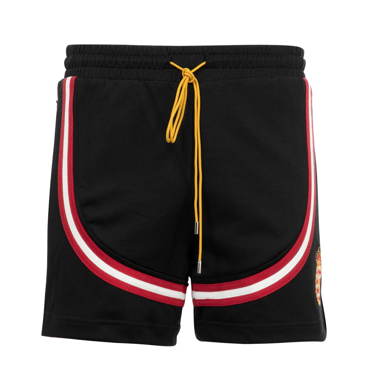 RHUDE Crest Veille Track Shorts featuring drawstring at elasticized rib-knit waistband, two pockets, logo applique at front and vented outseams. Made in United States. DESIGNER STYLE ID: RHSS25SH01230 COLOR: 1881 BLACK/WHITE/RED