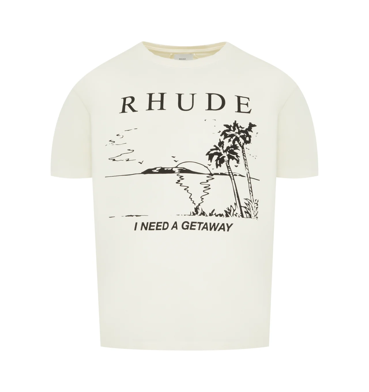RHUDE I Need A Getaway T-Shirt featuring oversized fit, graphic on front, crewneck, short sleeves and dropped shoulders. 100% cotton. DESIGNER STYLE ID: RHPS26TT09012 COLOR: 3166 VINTAGE WHITE/BLACK