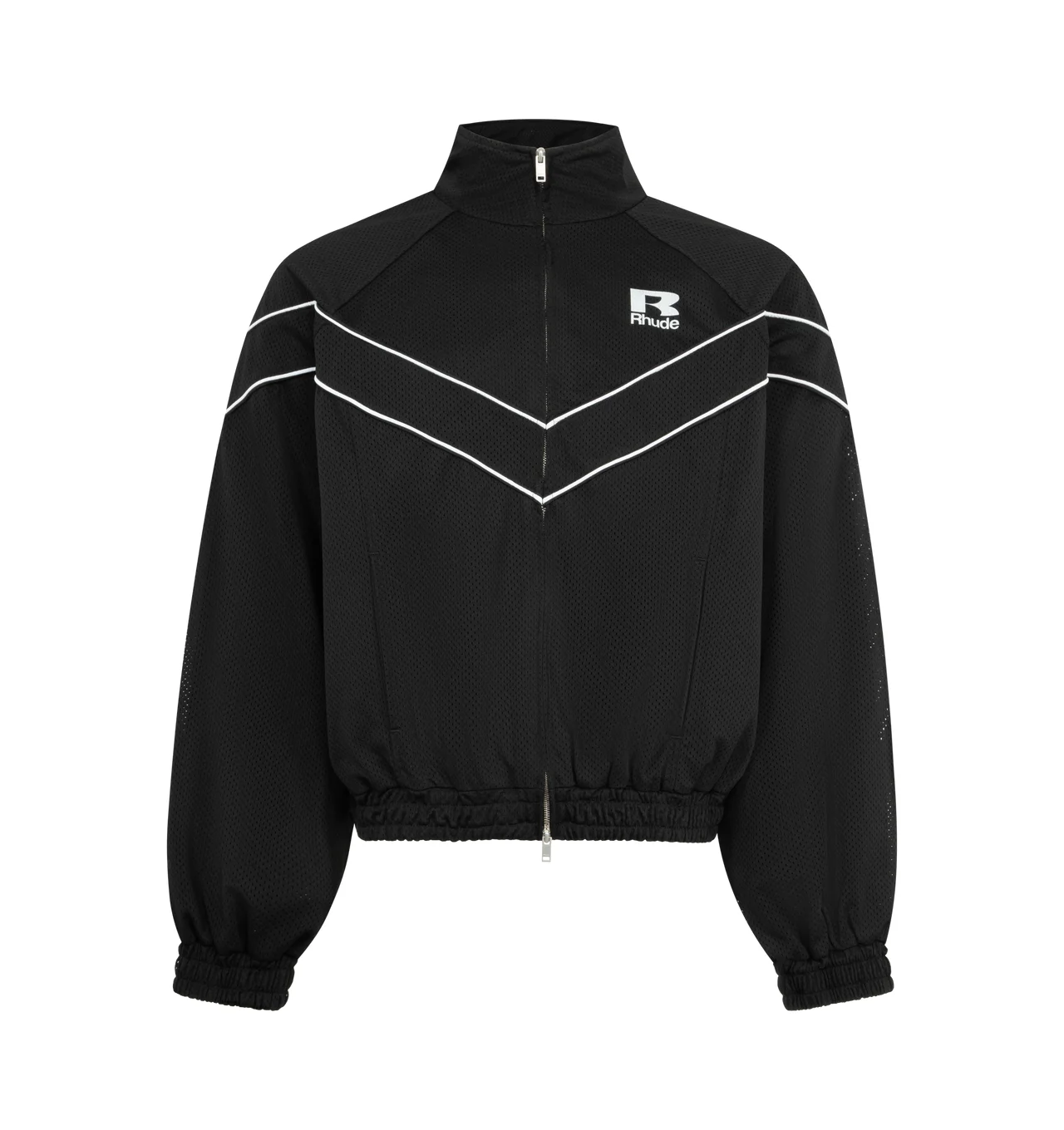 RHUDE Mesh Poping Raglan Track Jacket featuring a cotton and polyester-blend taffeta, stand collar, versatile two-way zip closure, RHUDE logo is displayed on the chest, contrasting piping on front, sleeves, and back, welt pockets, elasticized hem and cuffs and fully lined. 100% polyester. DESIGNER STYLE ID: RHPS26JA01041 COLOR: 3028 BLACK/WHITE