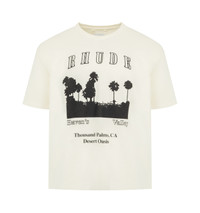 RHUDE Thousand Palms T-shirt featuring graphic print on front, jersey cotton, crewneck, short sleeves and pulls over. 100% cotton. Made in USA. DESIGNER STYLE ID: RHFW25TT02012 COLOR: 3161 VINTAGE WHITE/BLACK