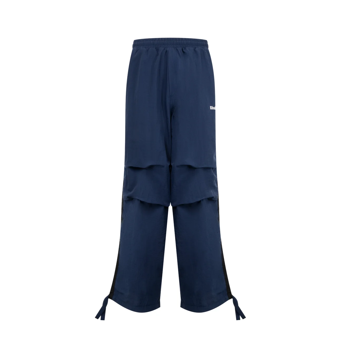 RHUDE Track Pants featuring concealed drawstring at elasticized waistband, four-pocket styling, logo printed at front, tucks at knees and drawstring at elasticized cuffs. Made in United States. DESIGNER STYLE ID: RHFW25PA01005 COLOR: 3182 BLUE/BLACK/WHITE