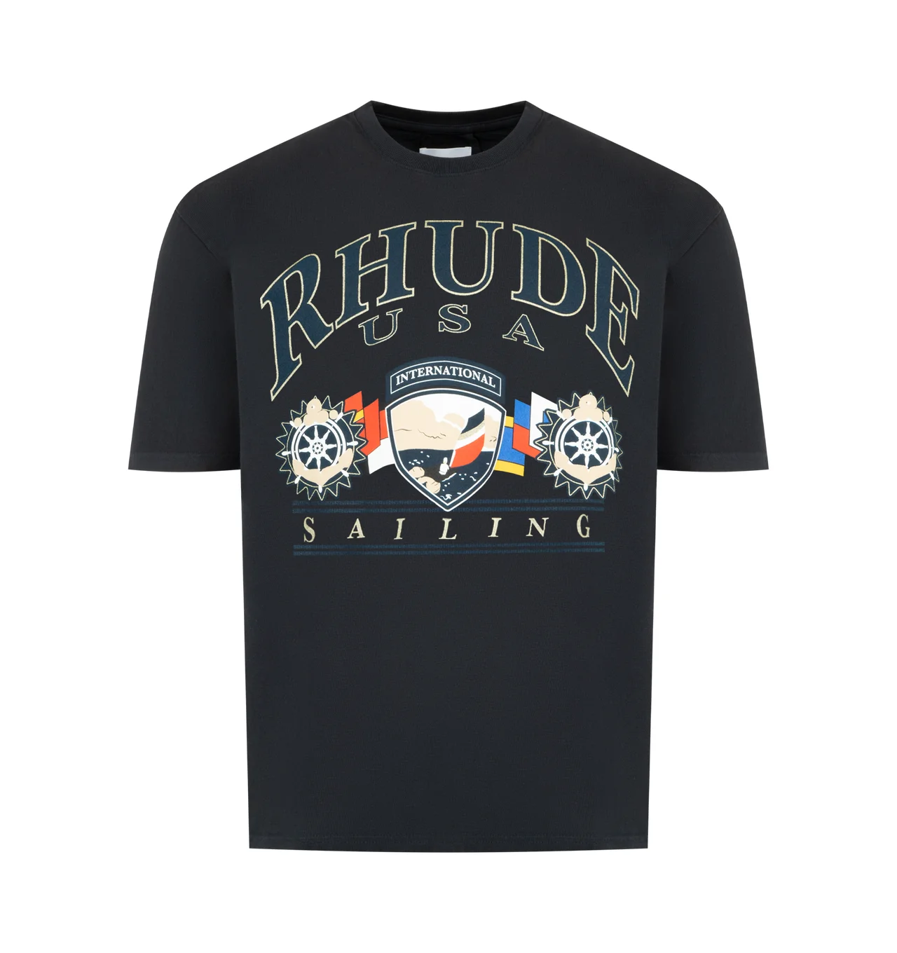 RHUDE USA Sailing Icon T-Shirt featuring regular fit, graphic on front, crewneck, short sleeves and dropped shoulders. 100% cotton. DESIGNER STYLE ID: RHPS26TT10012 COLOR: 3167 VINTAGE BLACK/WHITE