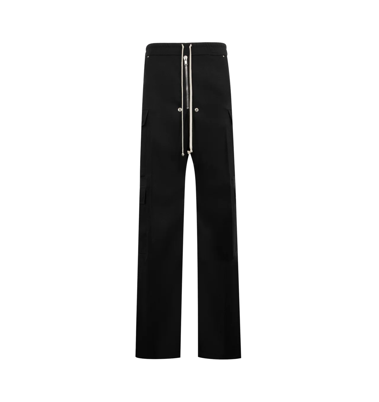 RICK OWENS Cargobelas Pants featuring wide-leg, drawstring at elasticized waistband, four-pocket styling, exposed zip fly, rivets, grommets, and press-stud hardware at front, dropped inseam and silver-tone hardware. Made in Italy. DESIGNER STYLE ID: RR02E1339-WD COLOR: 09 BLACK