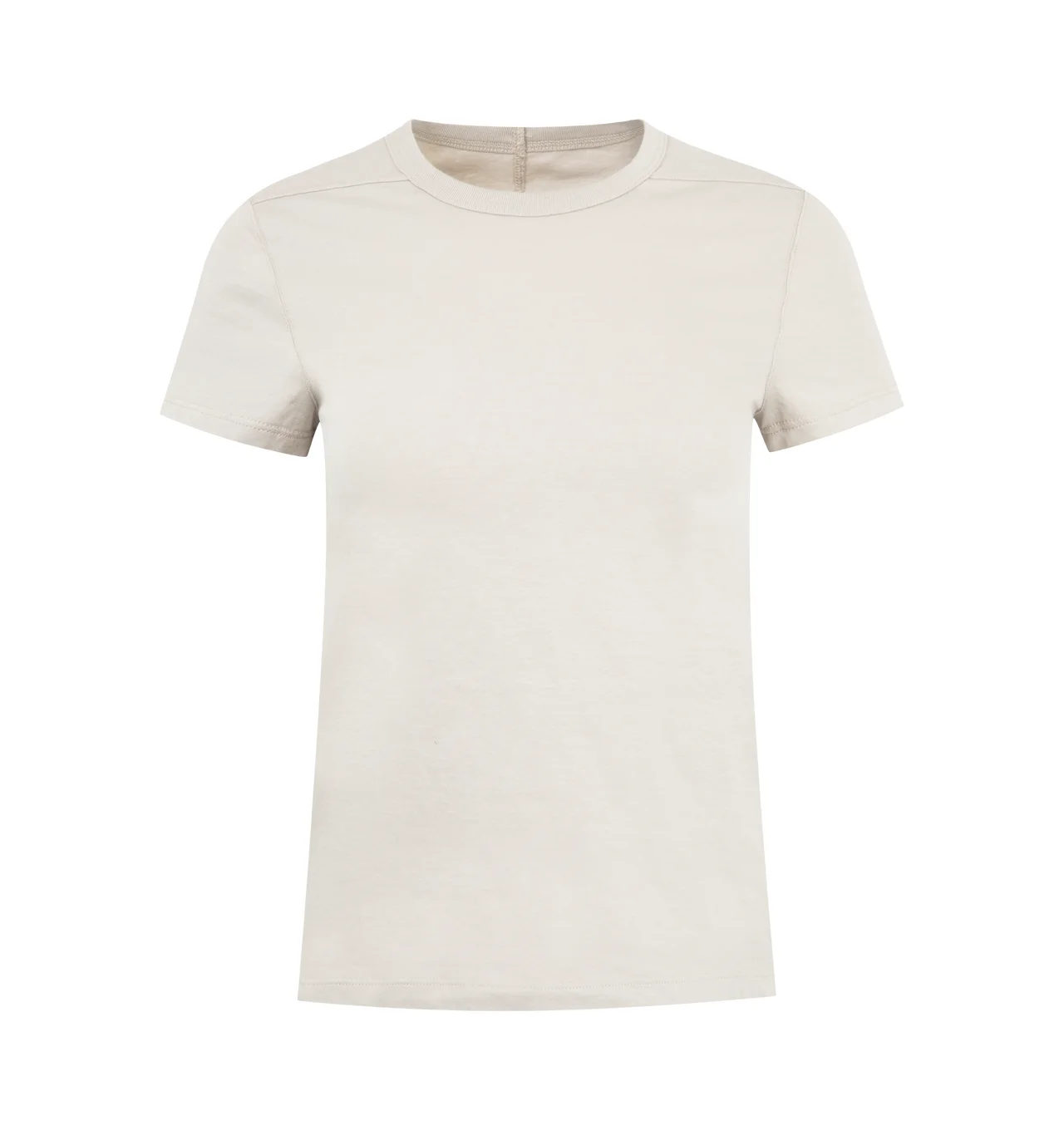RICK OWENS Cropped Level T featuring a shrunken cropped silhouette, crewneck, short sleeves and pulls over. 30% viscose, 30% nylon, 20% angora, 20% wool. Made in Italy. DESIGNER STYLE ID: RP01F6235-JA COLOR: 08 PEARL