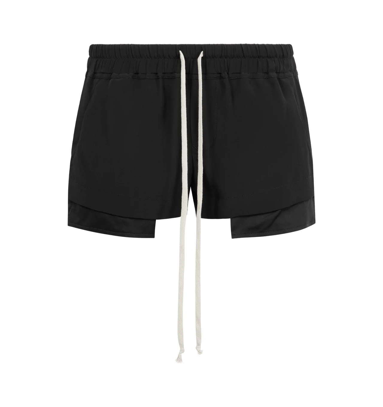 RICK OWENS Fog Boxers Shorts featuring drawstring at elasticized waistband, two-pocket styling, mock fly, exposed pocket lining at cuffs and vented outseams. 74% organic cotton, 26% linen. Made in Italy. DESIGNER STYLE ID: RP01F6316-CC COLOR: 09 BLACK