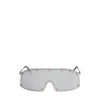 RICK OWENS Steel Shield Sunglasses featuring a surgical steel frame, curved lens with oversized round studs, adjustable rubber nose pads, thin arms and curved, capped temple tips. Steel/nylon. 100% UVA/UVB protection. Made in Italy. DESIGNER STYLE ID: RG0000001-GSILV COLOR: 1818 SILVER/SILVER