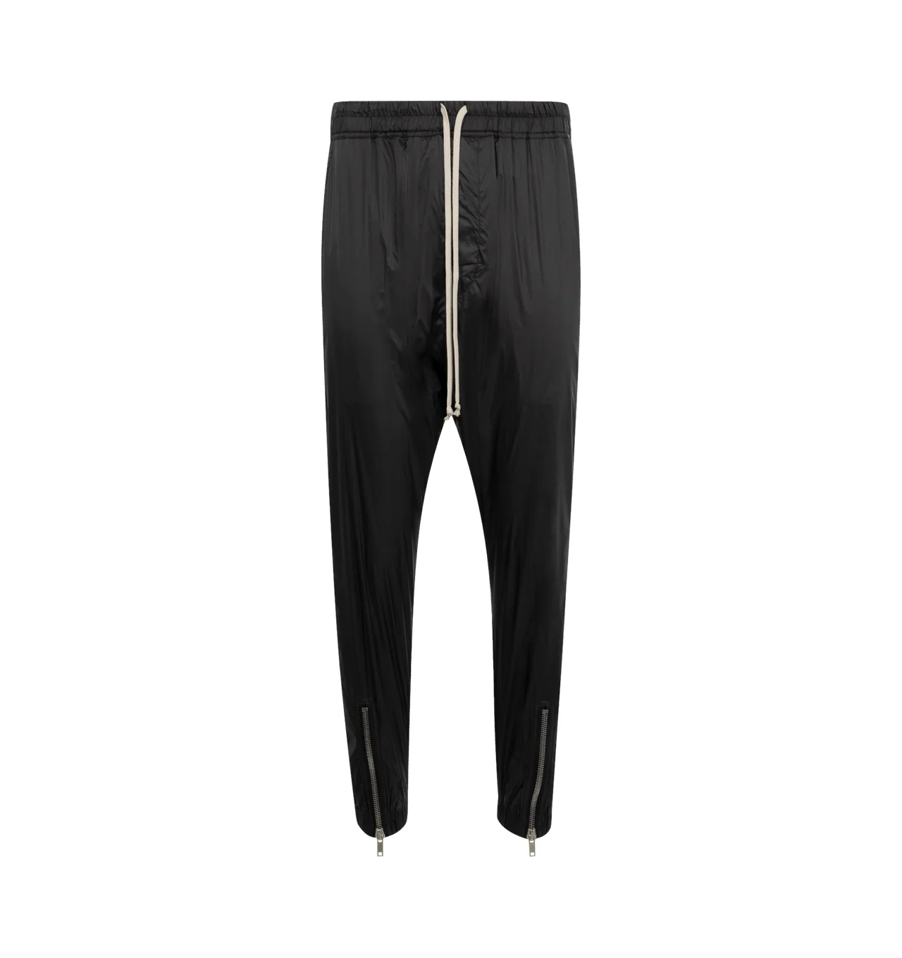 Rick Owens Men's Tecuatl Track Pant crafted from black lightweight, fluid cupro twill. Full-length style with slightly dropped crotch, elasticized waist band with drawstring and stitched fly. Featuring 2 diagonal side front pockets, back welt pockets with snaps and elasticized hems with a zippered slit on the front shin. 100% Cupro, plant-based, biodegradable fabric made using repurposed cotton waste fibers. Buttons made from 100% buffalo horn. DESIGNER STYLE ID: RU02E1331-NP COLOR: 09 BLACK