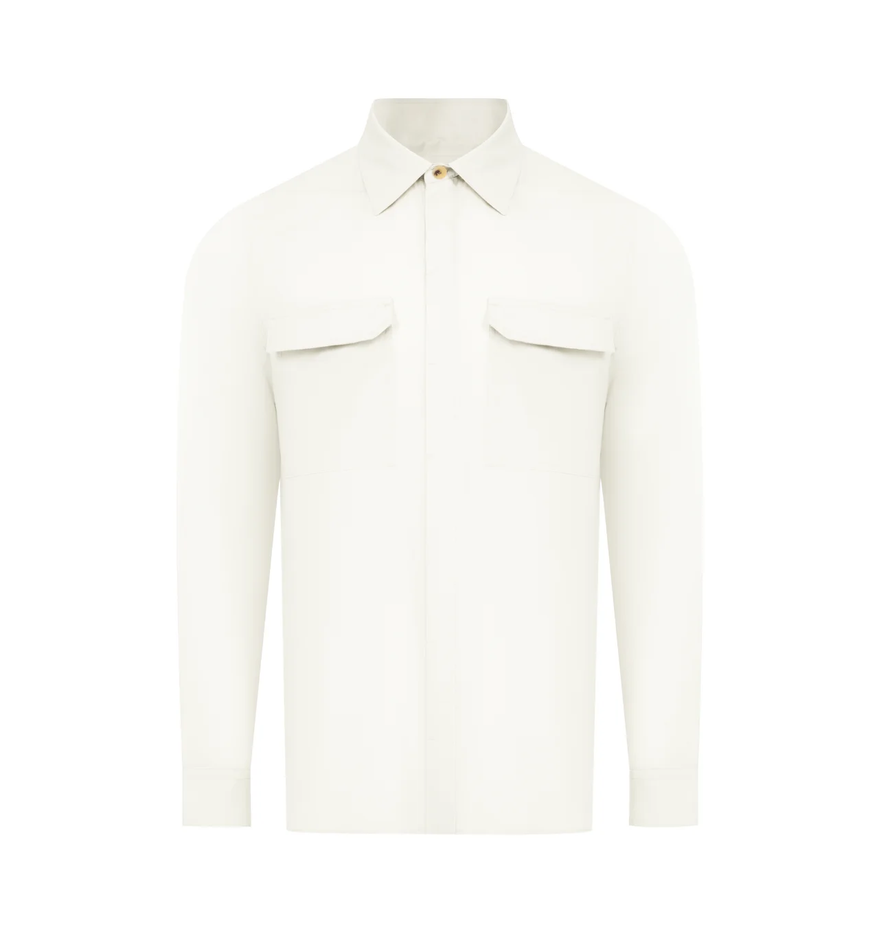 RICK OWENS Work Shirt featuring saddle shoulders with single-button barrel cuffs, concealed button closure, shirttail hem, spread collar and front flap pockets. 100% organic cotton. Made in Italy. DESIGNER STYLE ID: RU01F2291-P COLOR: 11 MILK