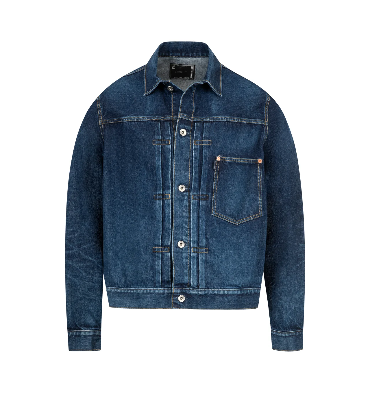 SACAI BEYONDEXX Denim Jacket featuring non-stretch denim, fading, whiskering, and distressing throughout, spread collar, button closure, pintucks at front, patch pocket at chest, buttoned barrel cuffs, cinch tab at back, logo-engraved hardware and contrast stitching in tan. 100% cotton. Made in Japan. DESIGNER STYLE ID: 25-03758M COLOR: 401 BLUE