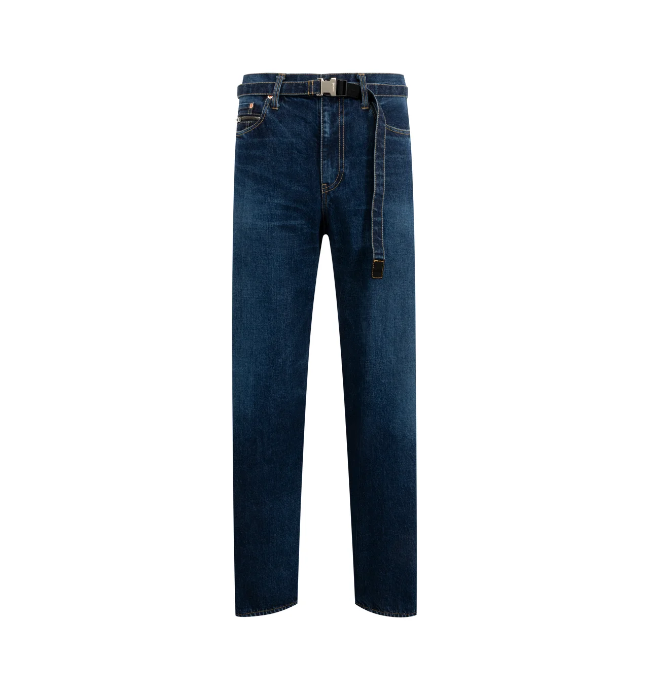 SACAI BEYONDEXX Jeans featuring straight-leg, belted, button and zip fastening and five pocket styling. 100% cotton. DESIGNER STYLE ID: 25-03759M COLOR: 401 BLUE
