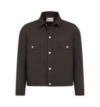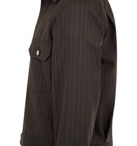 SACAI Chalk Stripe Jacket featuring button front closure, collar, button flap front pockets, buttoned cuffs, adjustable waist tabs and stripes throughout. DESIGNER STYLE ID: 26-03957M COLOR: 601 BROWN