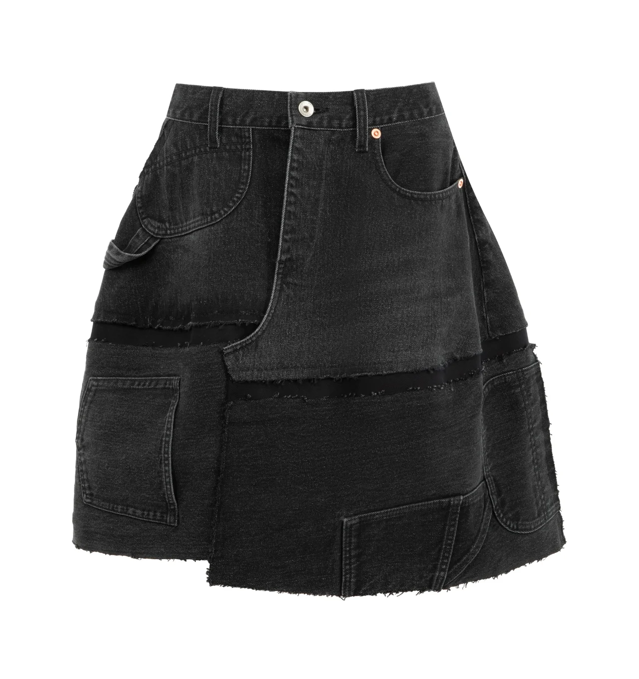 SACAI Denim Skirt featuring mini length, raw hem, patchwork design, button zip closure and belt loops. 100% cotton. DESIGNER STYLE ID: 26-08467 COLOR: 001 BLACK