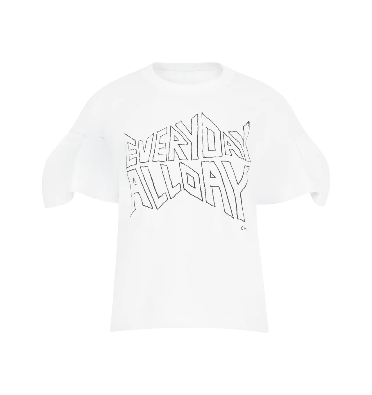 SACAI Geoff Jersey T-Shirt featuring short sleeves, crew neck, loose fit and graphic text on front. Cotton. DESIGNER STYLE ID: 26-08354 COLOR: 101 WHITE