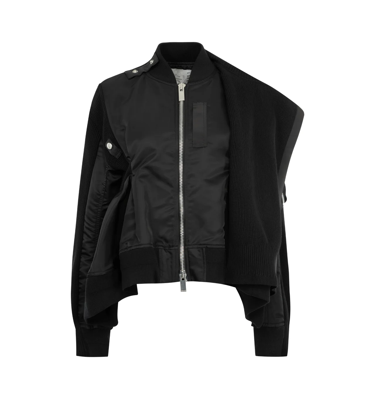 SACAI Nylon Twill x Knit Blouson featuring round neck, long sleeves, stitching details, stretch cuffs and hem. 52% cotton, 46% polyester, 1% nylon, 1% polyurethane. DESIGNER STYLE ID: 26-08451 COLOR: 001 BLACK