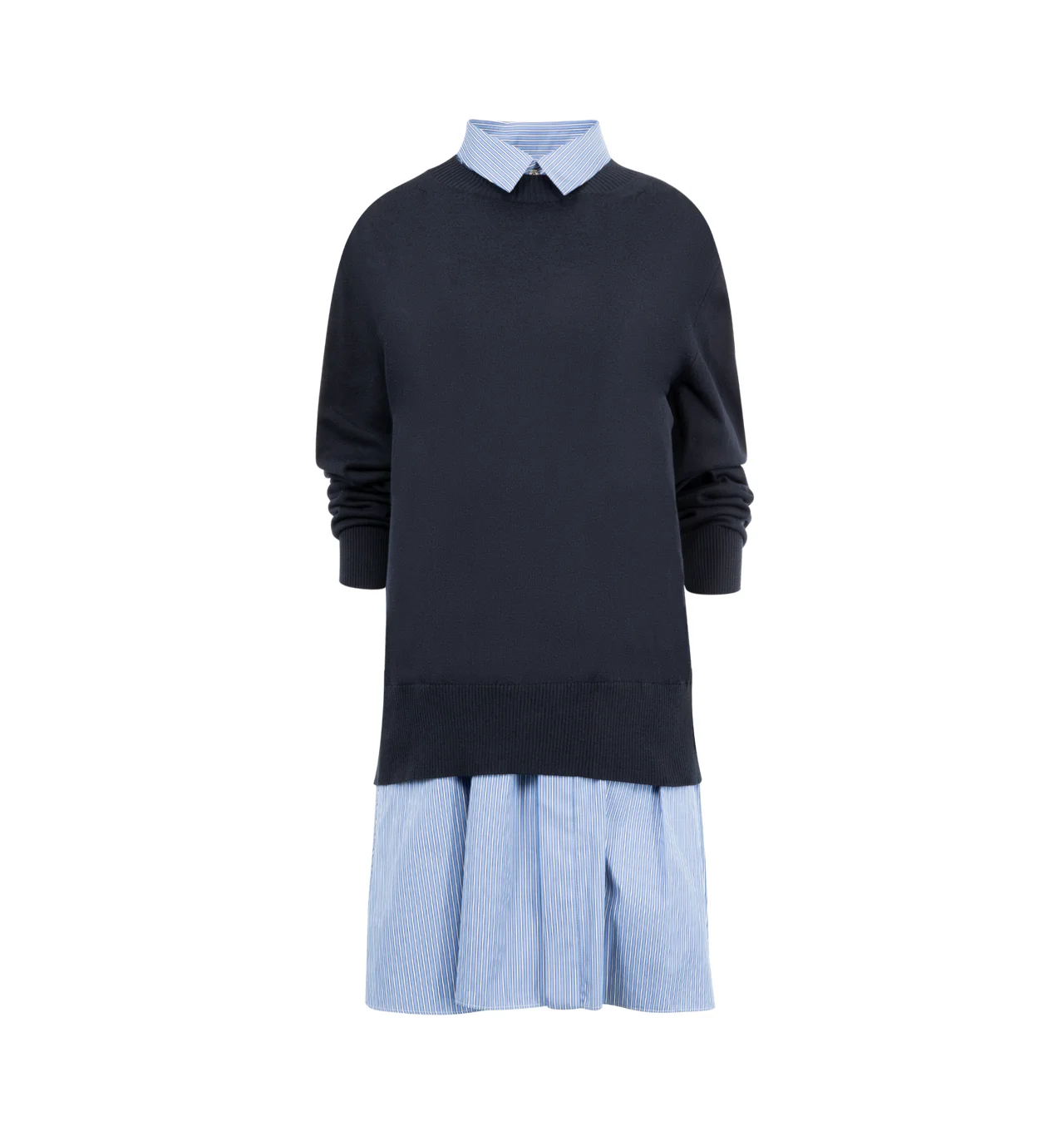 SACAI Poplin x Cotton Knit Dress featuring relaxed fit, knee length, mixed material, knit overlay and cotton poplin underlay. 100% cotton. DESIGNER STYLE ID: 25-08169 COLOR: 239 NAVY/BLUE STRIPE