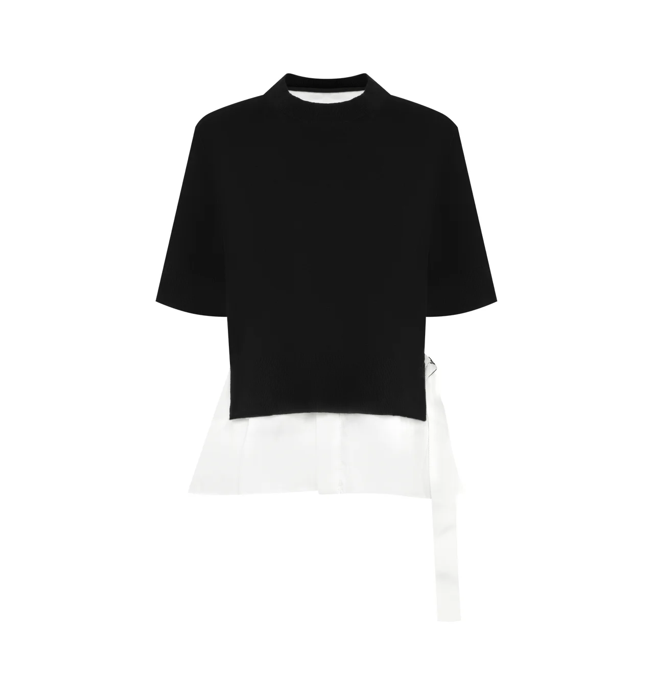 SACAI Poplin x Cotton Knit Pullover featuring crew neck, short sleeves, cotton poplin and knit cotton-blend top, layered hem, box pleat at back yoke and cinch strap at back waist. 100% cotton. 65% cotton, 35% polyester. DESIGNER STYLE ID: 26-08402 COLOR: 004 BLACK/OFF WHITE