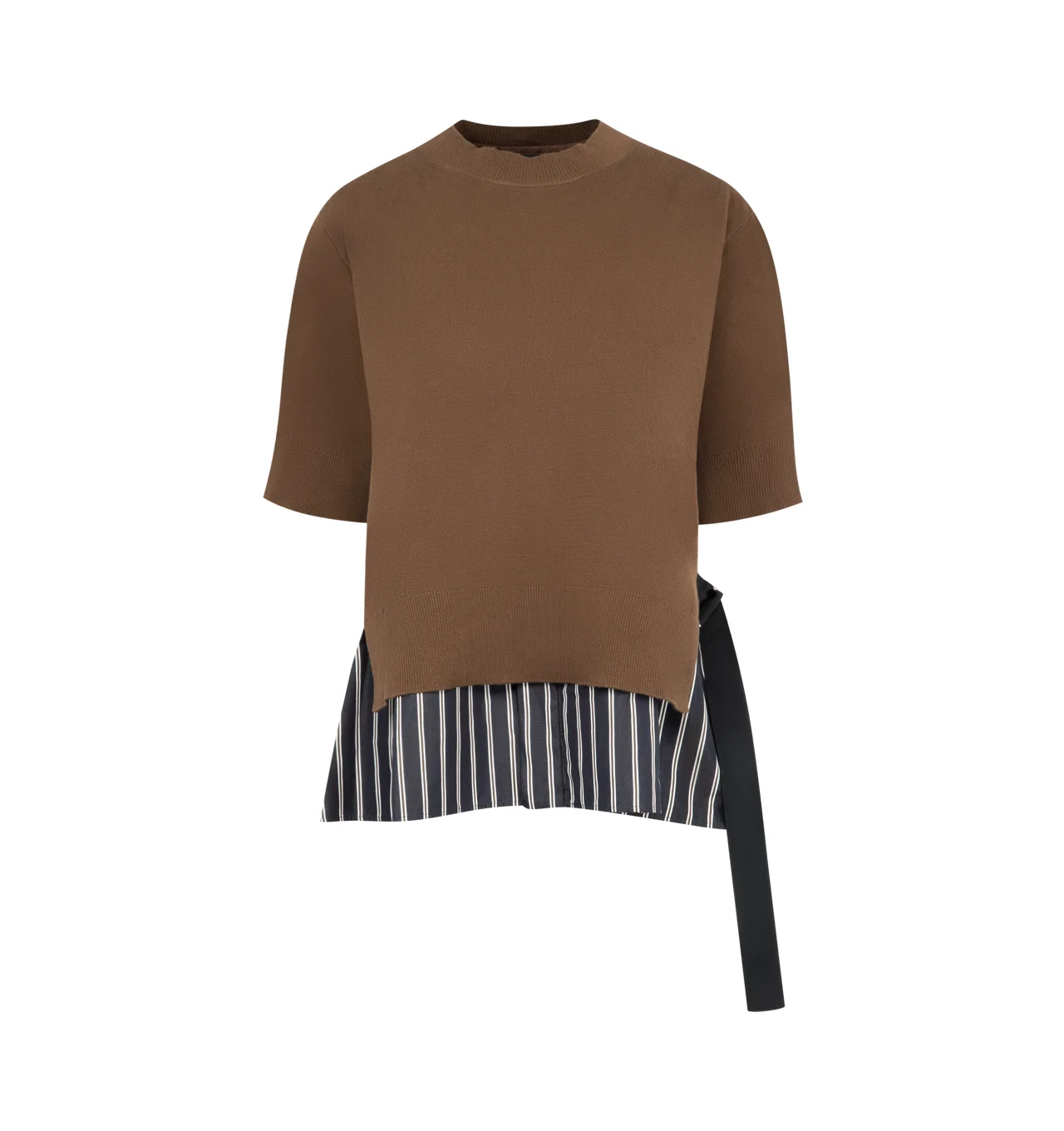 SACAI Poplin x Cotton Knit Pullover featuring crew neck, short sleeves, cotton poplin and knit cotton-blend top, layered hem, box pleat at back yoke and cinch strap at back waist. 100% cotton. 65% cotton, 35% polyester. DESIGNER STYLE ID: 26-08402 COLOR: 634 BROWN/NAVY STRIPE