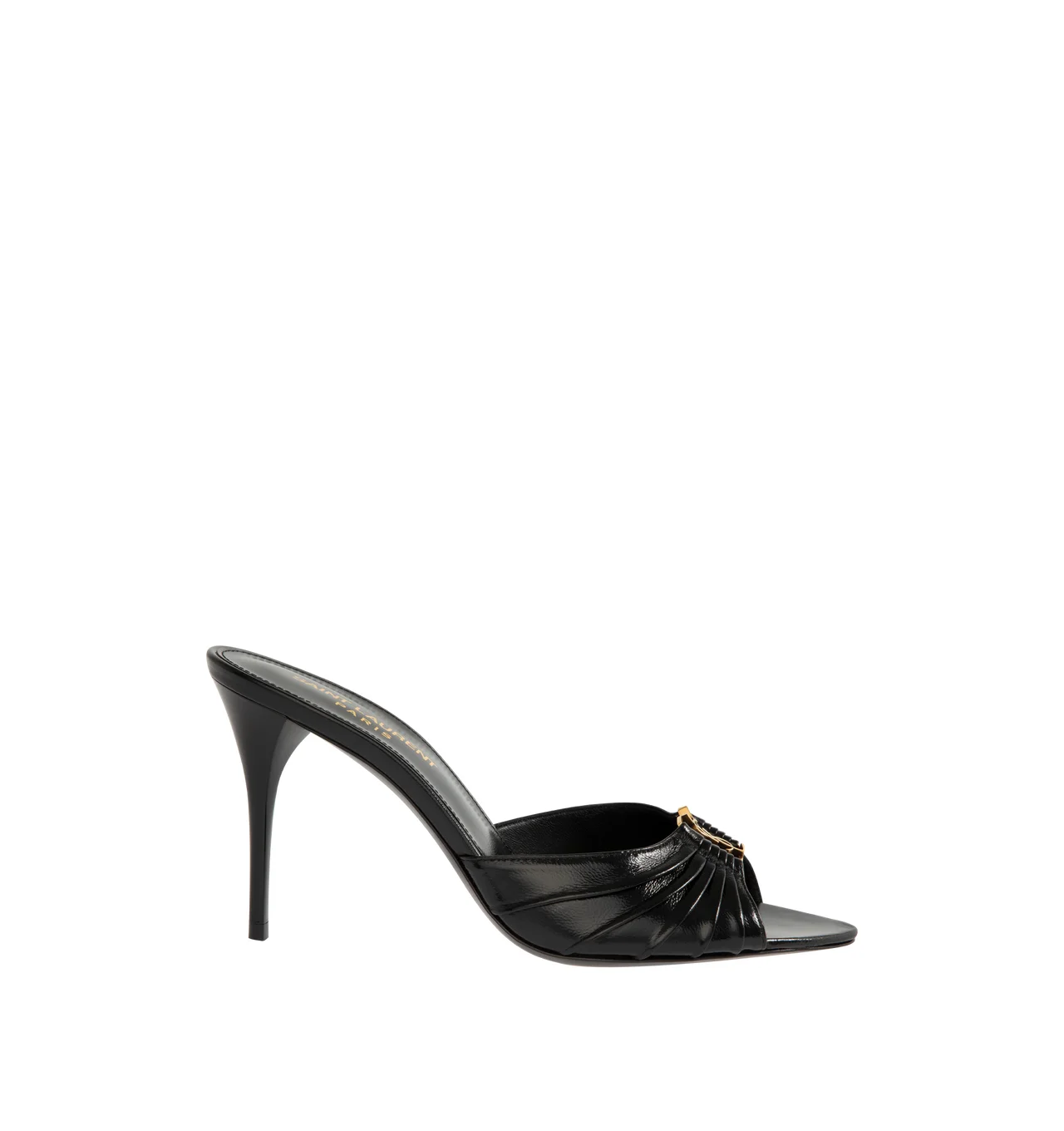 SAINT LAURENT Babylone Mule featuring stiletto mules with a pointed peep toe, gathered upper decorated with the cassandre and leather sole. 3.5 inches. Lambskin. Made in Italy. DESIGNER STYLE ID: 799606-AAC4K COLOR: 1000 NERO