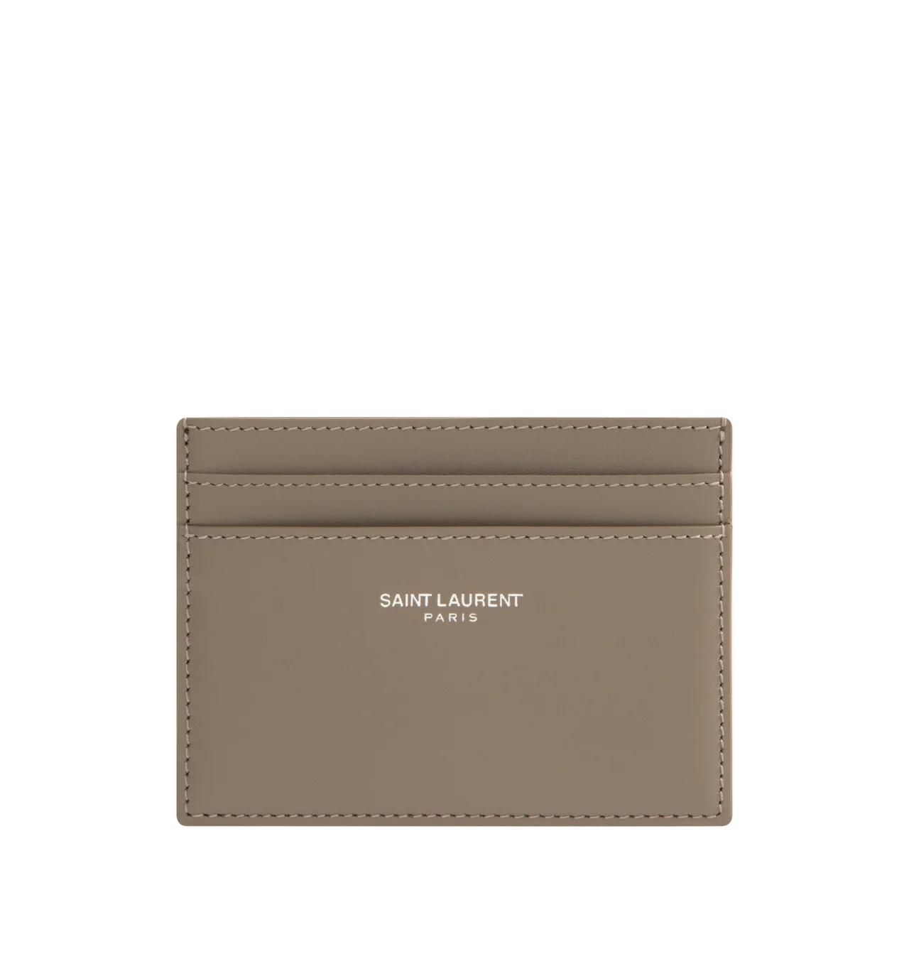 SAINT LAURENT Card Case featuring embossed Saint Laurent Paris signature, leather lining, silver toned hardware and five card slots. 3.9" X 3.1" X 0.1". 100% calfskin leather. DESIGNER STYLE ID: 375946-0U90E COLOR: 1799 PLAZA TAUPE