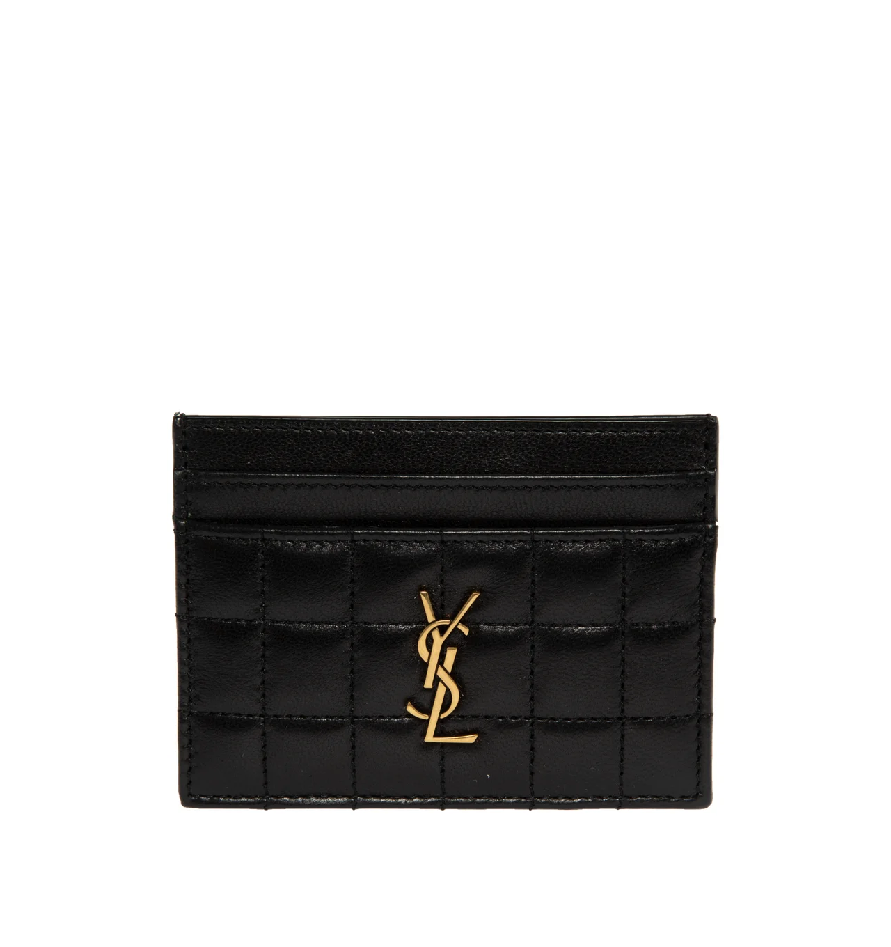 SAINT LAURENT Cassandre Matelasse Card Case featuring five card slots and leather lining. 4.1 X 3.1 X 0.3 inches. 100% lambskin. Made in Italy. DESIGNER STYLE ID: 742760-AABVP COLOR: 1000 BLACK
