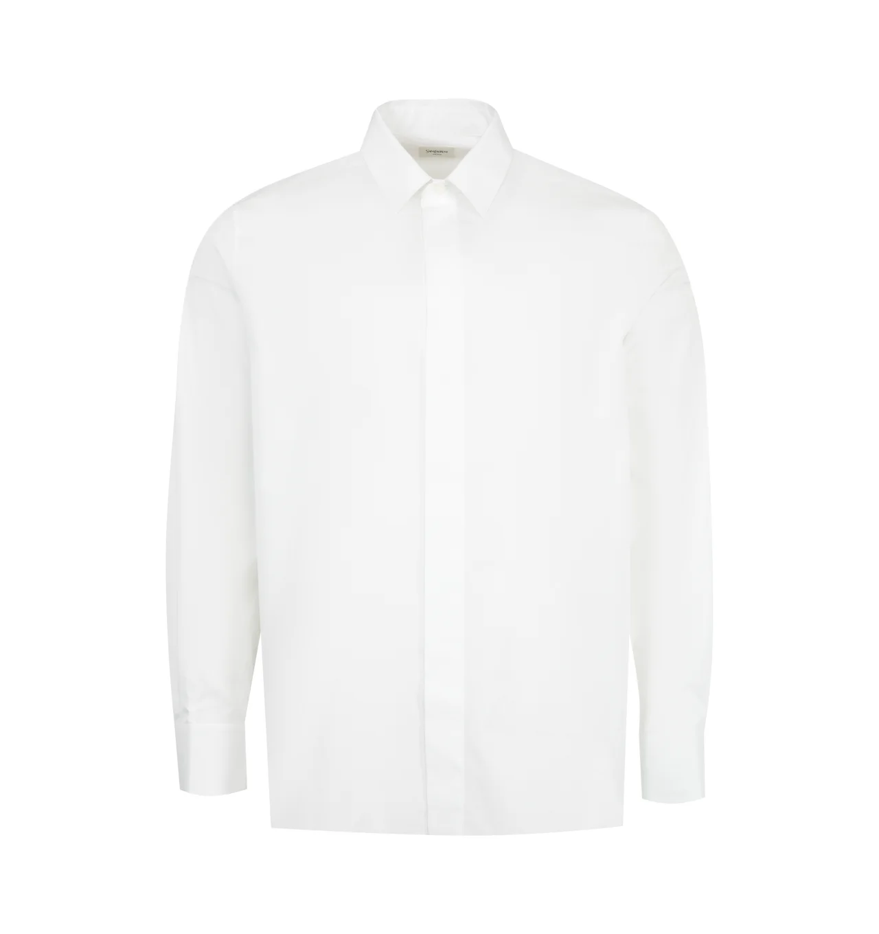 SAINT LAURENT Cassandre Shirt in cotton poplin featuring a pointed collar, cassandre embroidery at the hip, concealed front button closure, one-button cuffs, straight hem and back center box pleat. 100% cotton. DESIGNER STYLE ID: 826821-Y217W COLOR: 9000 BLANC