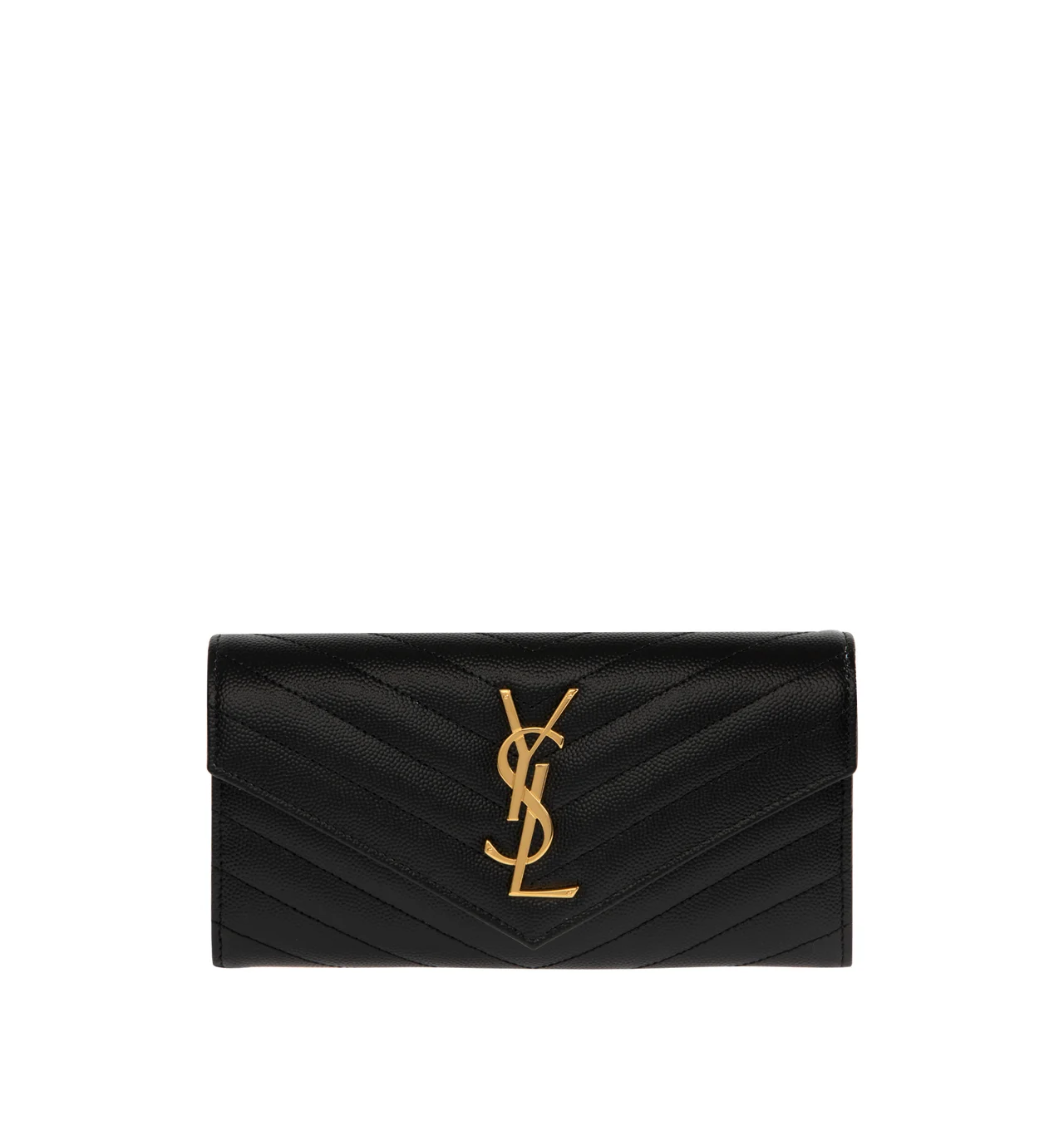 SAINT LAURENT Large Wallet featuring large flap wallet made with metal-free tanned leather, cassandre on front, gold-toned metal hardware, snap button fastening, twelve card slots, one coin pocket, two bill compartments, two receipt compartments and quilted overstitching. 7.4 x 4.3 x 1.1 inches. Calfskin. Made in Italy. DESIGNER STYLE ID: 372264-B0W01 COLOR: 1000 BLACK