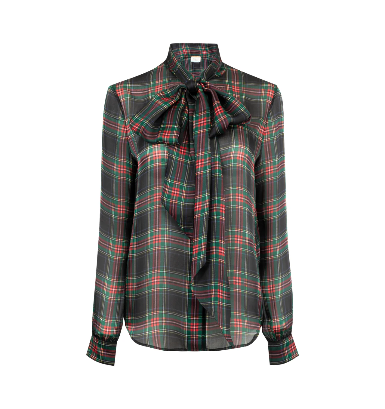 SAINT LAURENT Lavalliere Blouse in tartan silk charmeuse featuring a lavalliere tie, concealed front button closure, lavalliere neck, one-button mitered cuffs and curved hem. 100% silk. Made in Italy. DESIGNER STYLE ID: 842861-Y1H96 COLOR: 1052 NOIR MULTICO