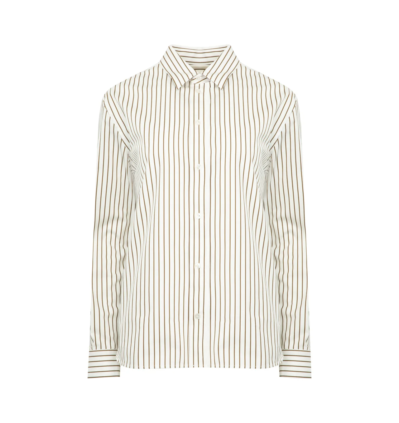 SAINT LAURENT Striped Shirt featuring striped cotton poplin buttoned shirt with a pointed collar, chest pocket with logo embroidery, front button closure, one-button mitered cuffs and straight hem. 100% cotton. Made in Italy. DESIGNER STYLE ID: 859262-Y6J55 COLOR: 9603 CRAIE/KAKI DORE