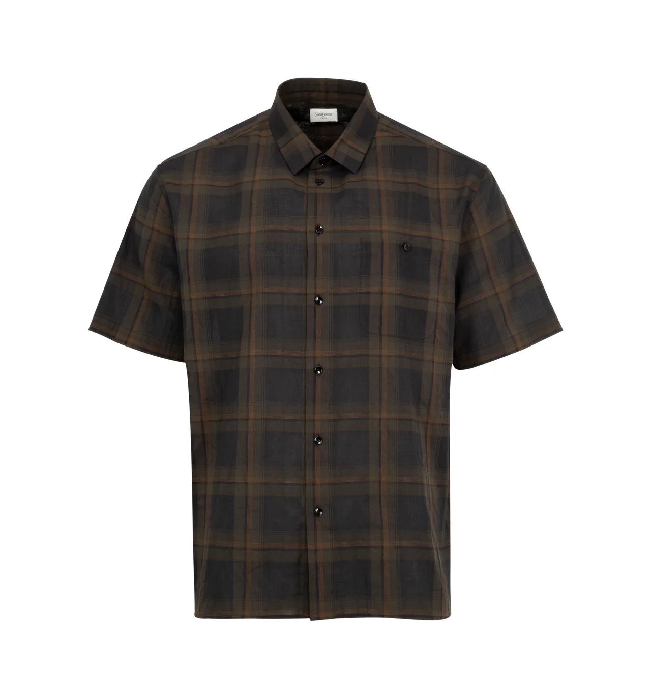 SAINT LAURENT Tartan Shirt featuring short-sleeves, buttoned shirt made with certified cotton, a pointed collar and chest pocket. 100% cotton. Made in Italy. DESIGNER STYLE ID: 832990-Y2M31 COLOR: 3746 KAKI MULTICOLORE