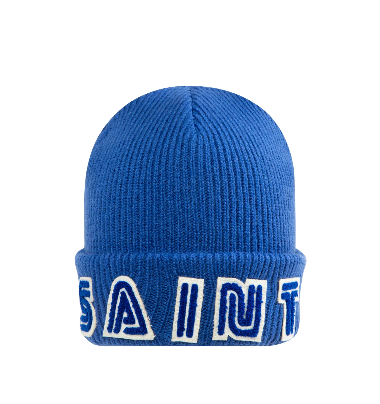 SAINT MICHAEL SG Saint Sega Knit Beanie featuring ribbed knit, folded brim and embroidered logo. DESIGNER STYLE ID: SM-HR1-0000-C66 COLOR: BLUE