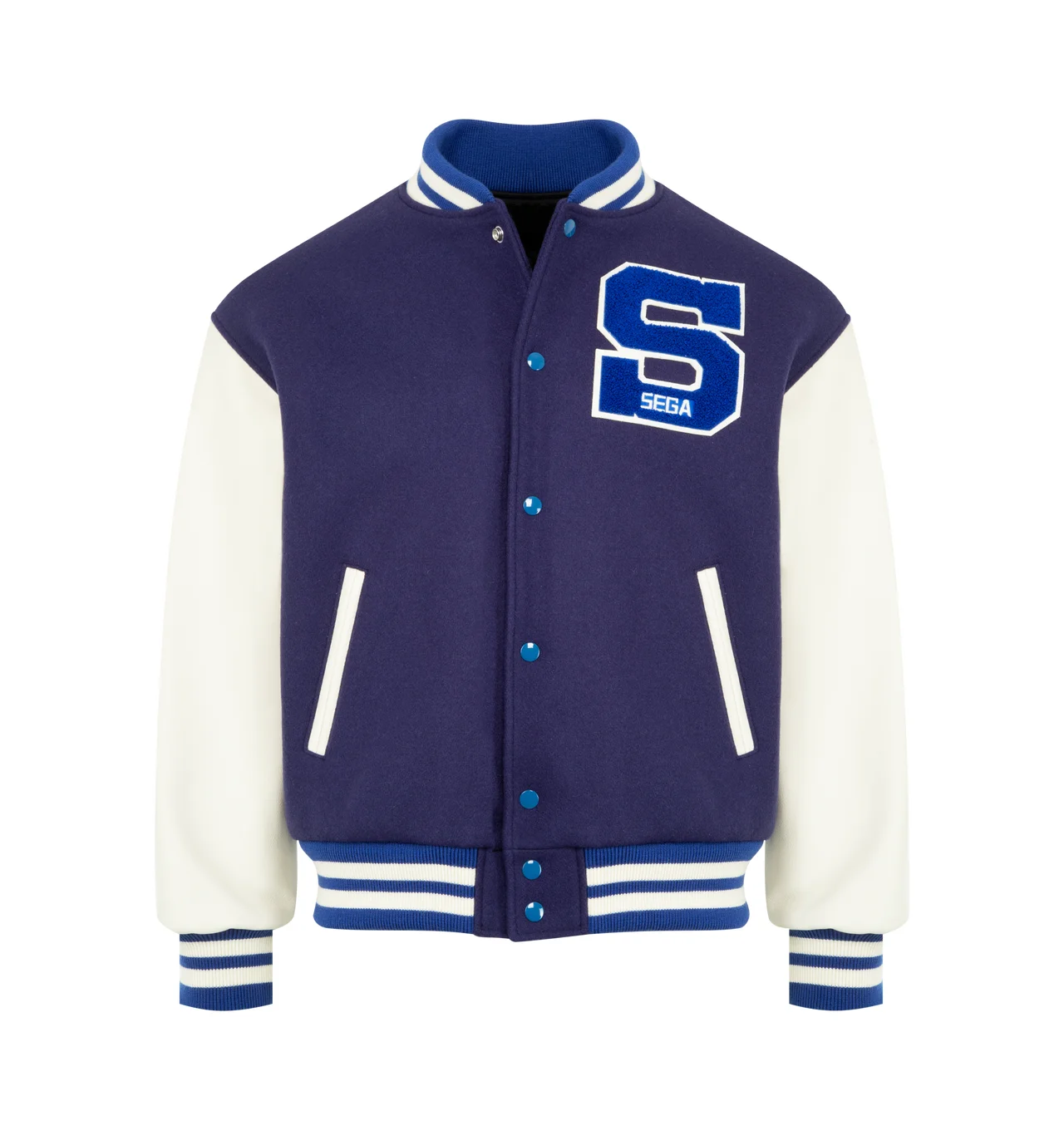 SAINT MICHAEL SG Saint SEGA Varsity Jacket featuring applique striped ribbed trim, press-stud fastening, side welt pockets and long sleeves. 90% wool, 10% nylon. DESIGNER STYLE ID: SM-HR1-0000-C63 COLOR: BLUE