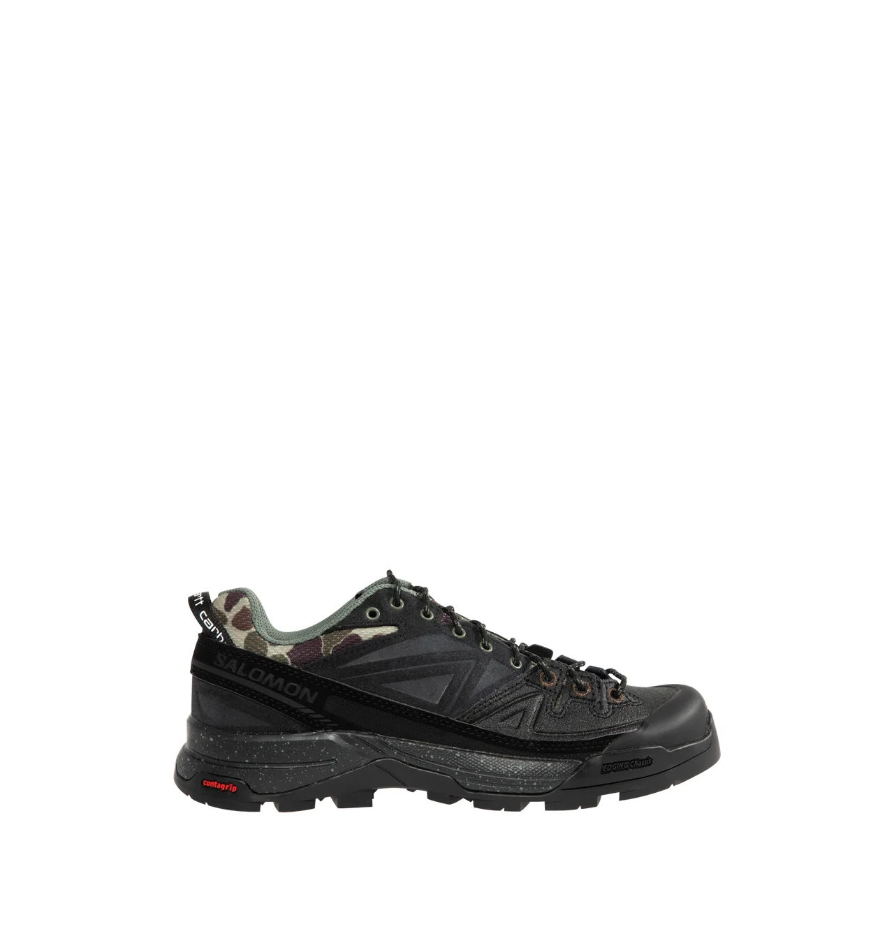 SALOMON x Carhartt WIP X-ALP Sneaker featuring suede and textile upper, leather overlays, camouflage details, printed branding, EVA midsole and contagrip® rubber outsole. DESIGNER STYLE ID: L49165500 COLOR: BLACK/BLACK/BLACK