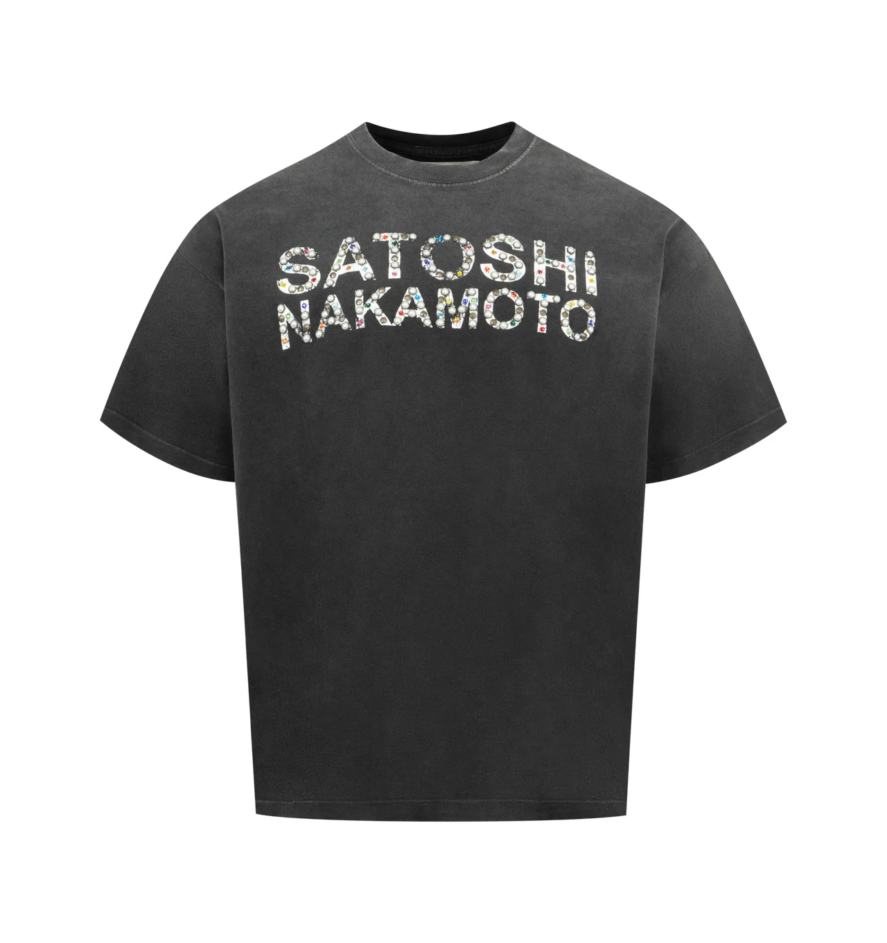 SATOSHI NAKAMOTO Pearl Studded Logo Tee featuring boxy fit, dropped shoulders, screen-printed graphic, pearl studded design and washed treatment. 100% cotton. DESIGNER STYLE ID: FW25TEE019 COLOR: WASHED BLACK