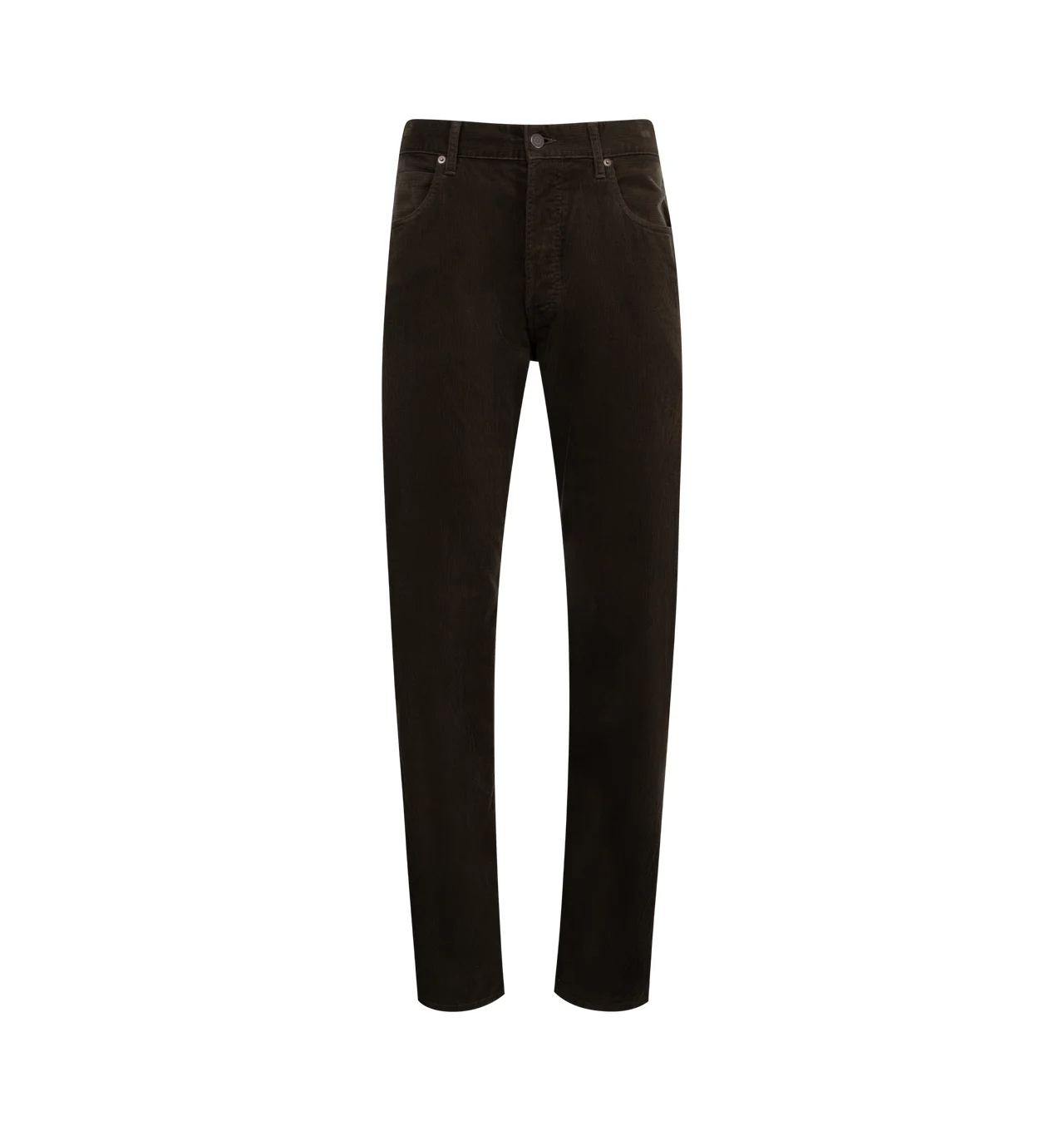 SEEKINGS 98 Fit Jeans featuring corduroy, baggy fit with tapered leg, 5 pocket styling, button fly, high rise, leather patch on back of waistband and engraved hardware. 100% cotton. DESIGNER STYLE ID: S3D120CR460 COLOR: DARK BROWN