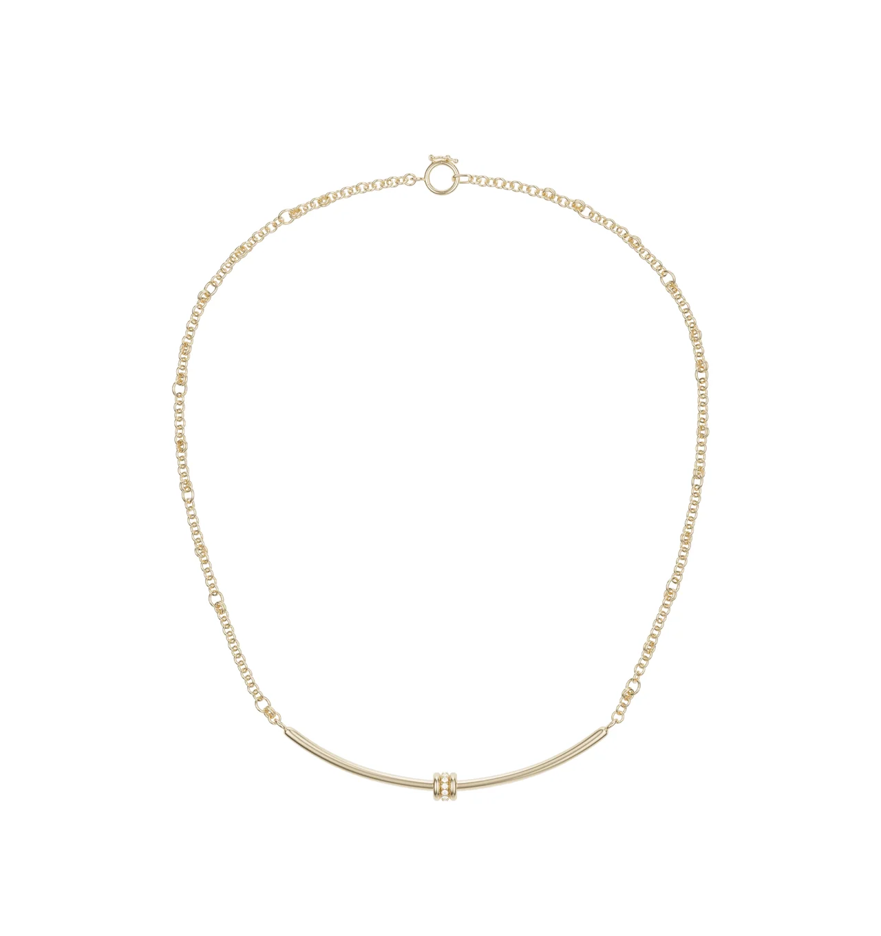 SPINELLI KILCOLLIN Gravity Arc Necklace featuring 18k yellow gold with a central bar with three unfixed annulets, a safety circle clasp and multi-gauged chain design allows the necklace to be worn comfortably at adjustable lengths. Chain: 18k yellow gold. Length: 16 inches total, 14 inches adjustable. Bar: 18k yellow gold. Annulets: 18k yellow gold. Central pave-set annulet. Stones: White diamonds (approx. 0.09 cttw). Safety Clasp: 18k yellow gold. For personal consultation and detailed information about jewelry, please contact our dedicated stylist team at personalshopping@hirshleifers.com. This item may be restricted for online purchase to international clients. For assistance purchasing this item please contact our dedicated stylist team at personalshopping@hirshleifers.com. DESIGNER STYLE ID: N-GRYGPV COLOR: YG/DIA