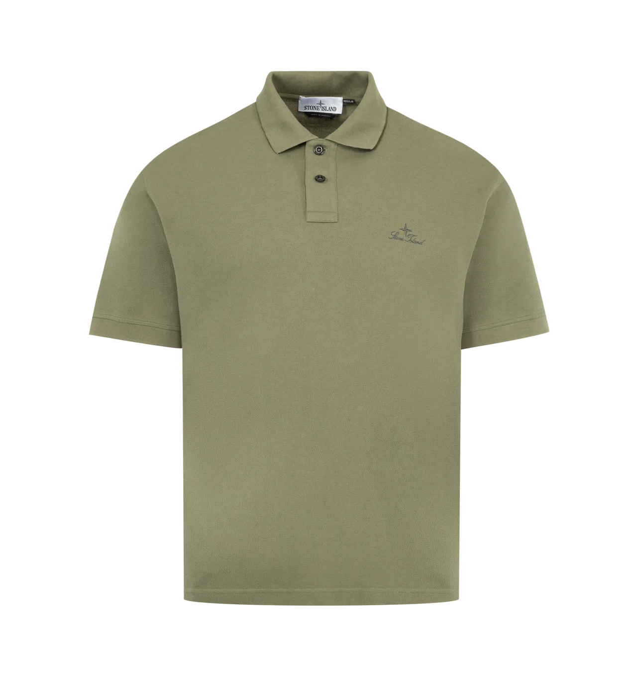 STONE ISLAND Cotton Polo featuring ribbed collar, sleeve cuffs, two-button fastening, Stone Island logo script embroidery on chest and regular fit. 100% cotton. DESIGNER STYLE ID: 2200001-S0039 COLOR: V005G MILITARY GREEN